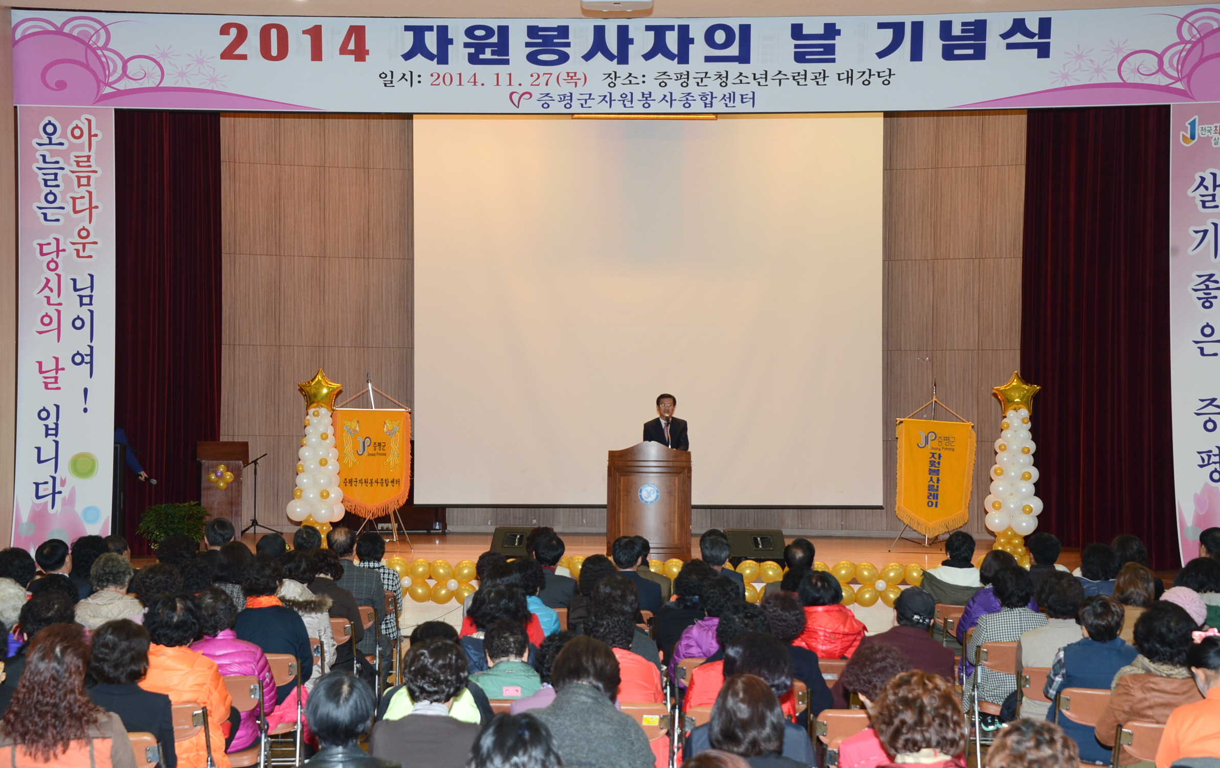 증평군자원봉사종합센터(센터장 김남순)는 27일 오후 1시부터 청소년수련관 대강당에서 자원봉사자 300여명이 참석한 가운데 ‘2014 자원봉사자의 날 기념식’을 개최했다. [보도자료실 참조]