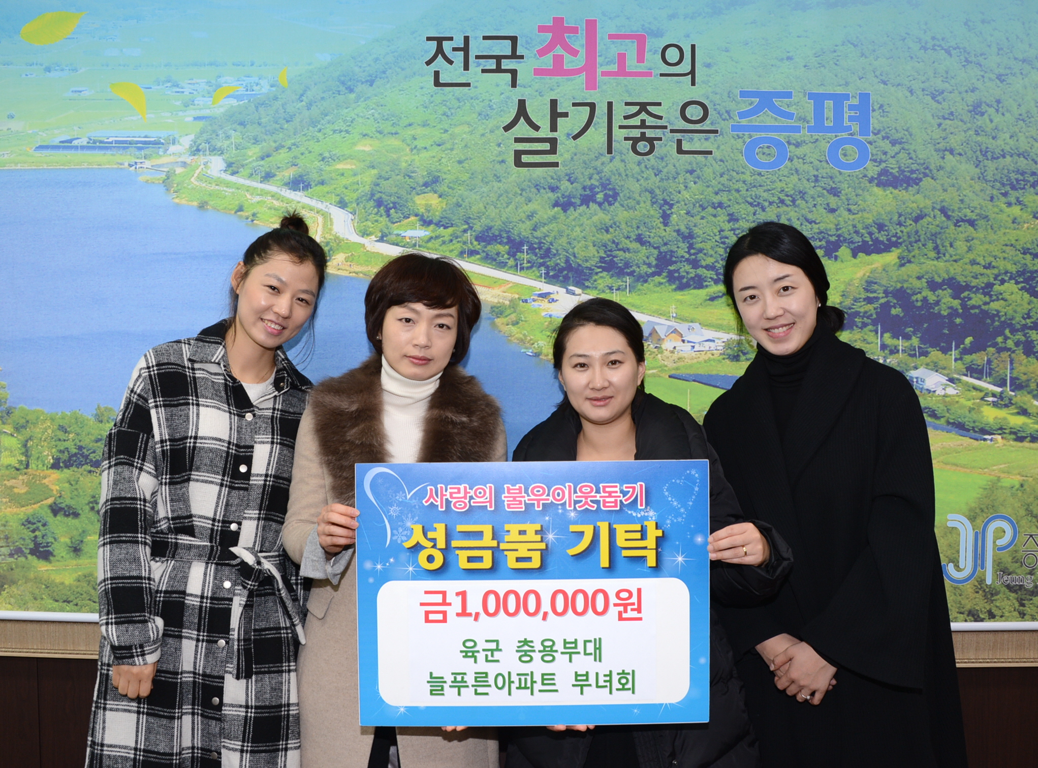 증평읍 증천동에 위치한 육군 37사단 충용부대 늘푸른아파트 부녀회(회장 이윤희)에서는 20일 증평군의 불우이웃을 위해 써달라며 현금 100만원을 전달했다. [보도자료실 참조]