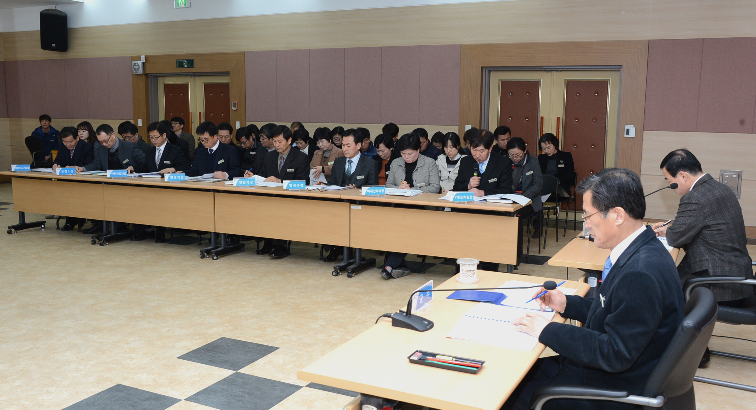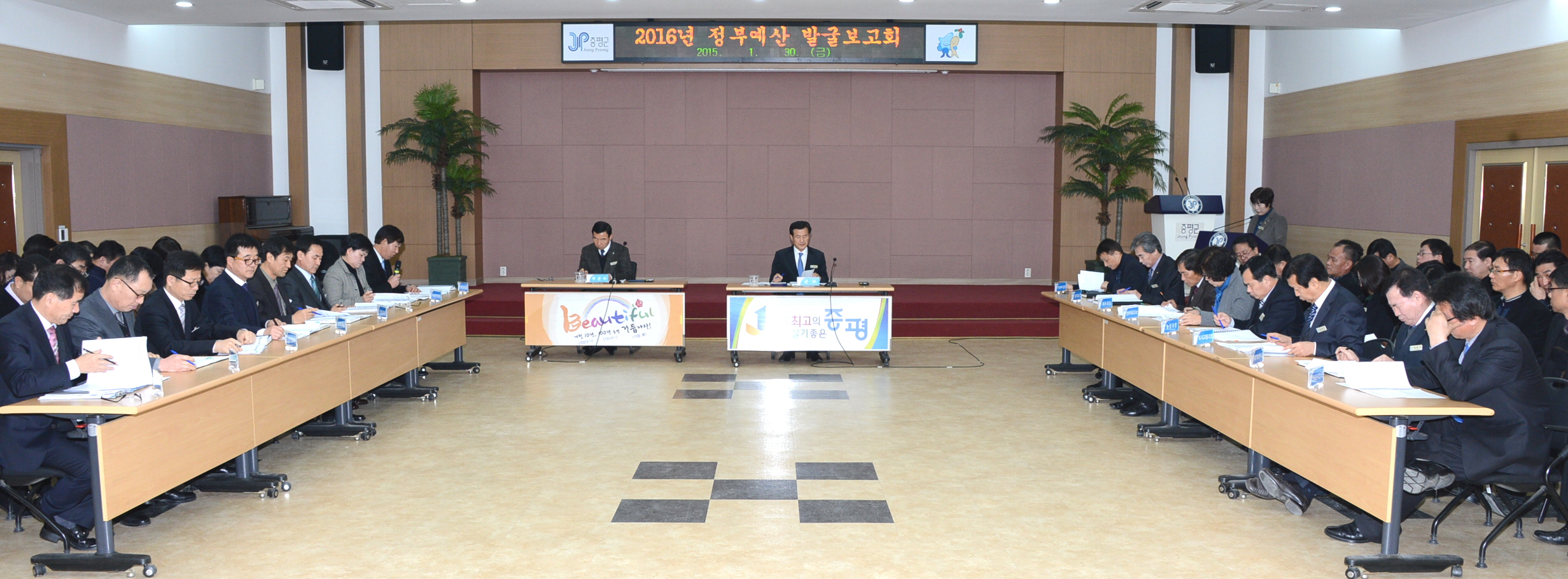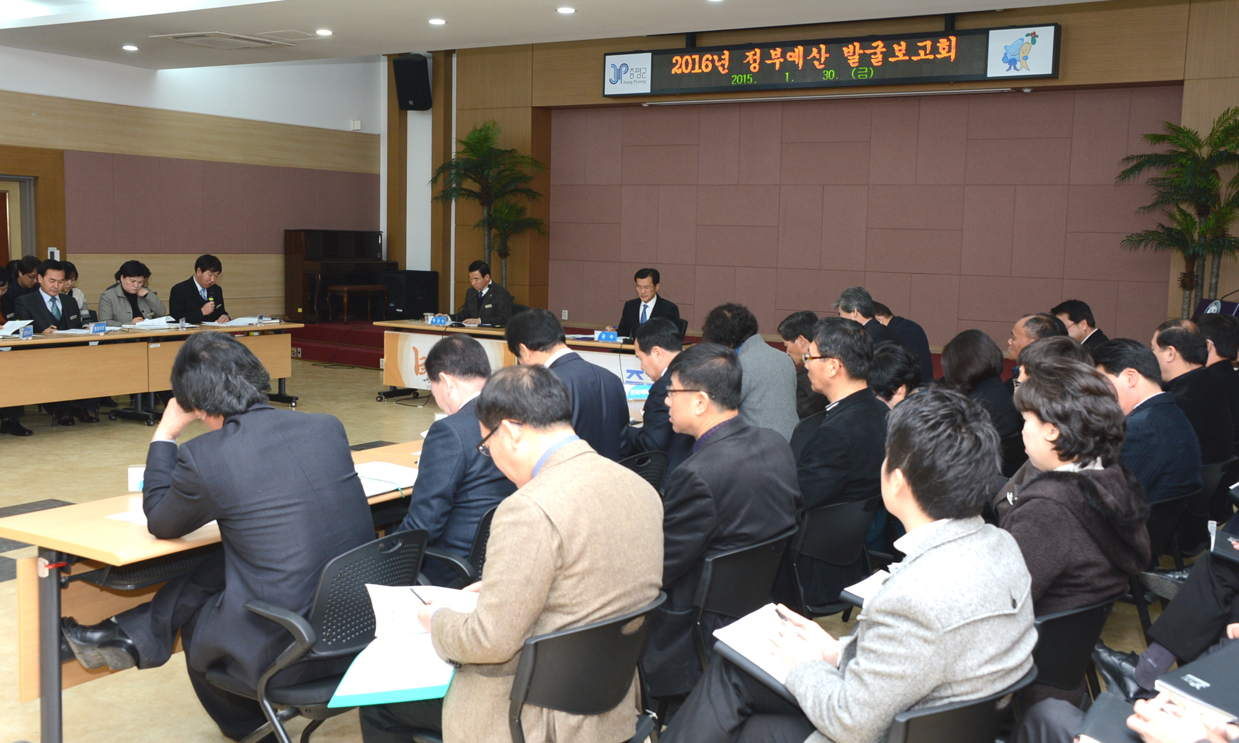 증평군은 30일 군청 대회의실에서 각 부서장과 팀장 등 60여명이 모인 가운데 홍성열 군수 주재로 상반기 조기집행 및 2016년도 정부 예산확보를 위한 대책보고회를 개최했다.[보도자료실 참조]