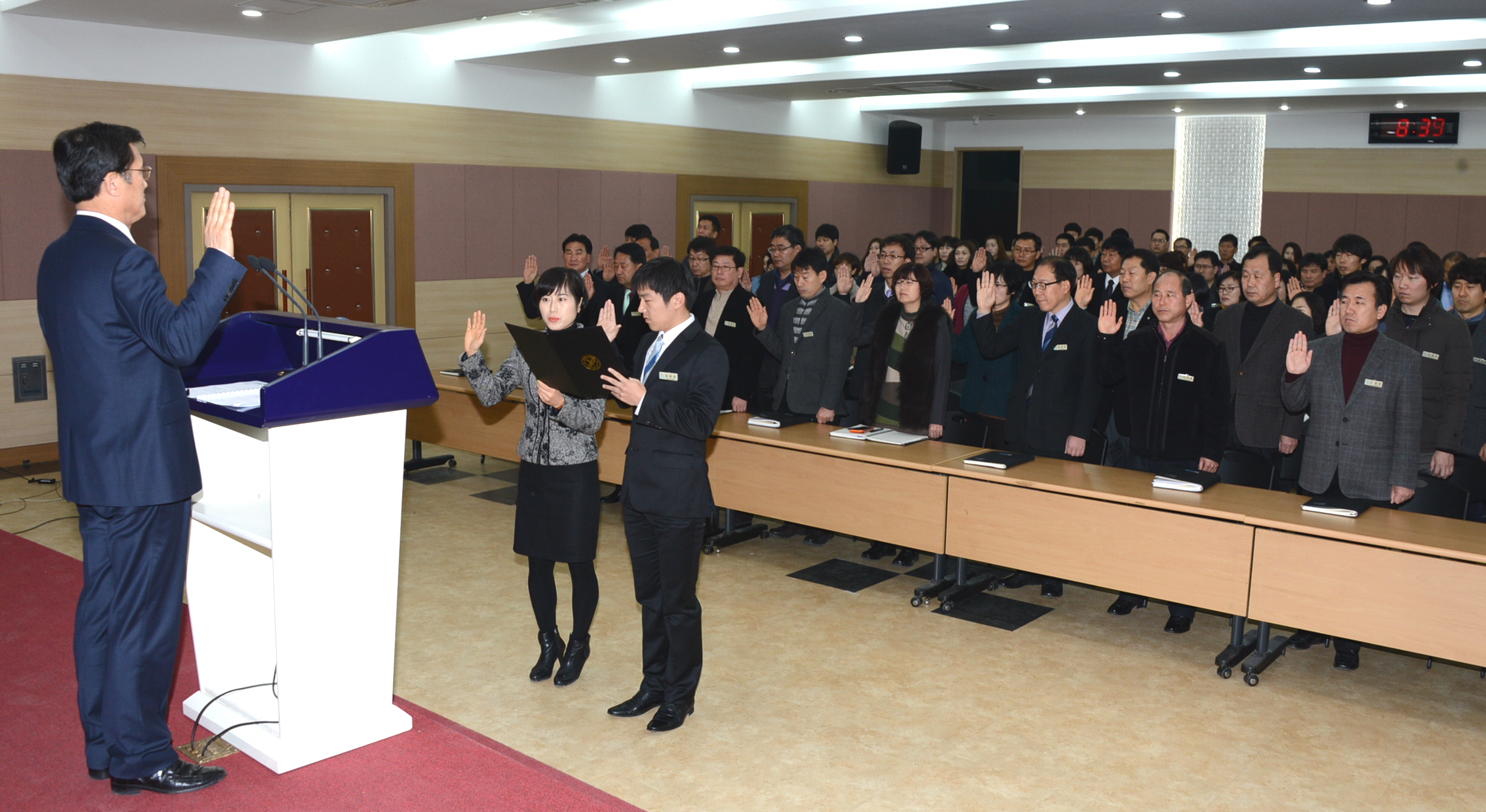 증평군은 2일 군청대회의실에서 공직자 200여명이 참석한 가운데 민원접수단계부터 민원처리 전 과정에서 불만이나 이의가 있을 경우, 시정을 요구할 수 있는 권리가 있음을 알리는 ‘민원미란다 고객의 권리’를 선언했다. [보도자료실 참조]