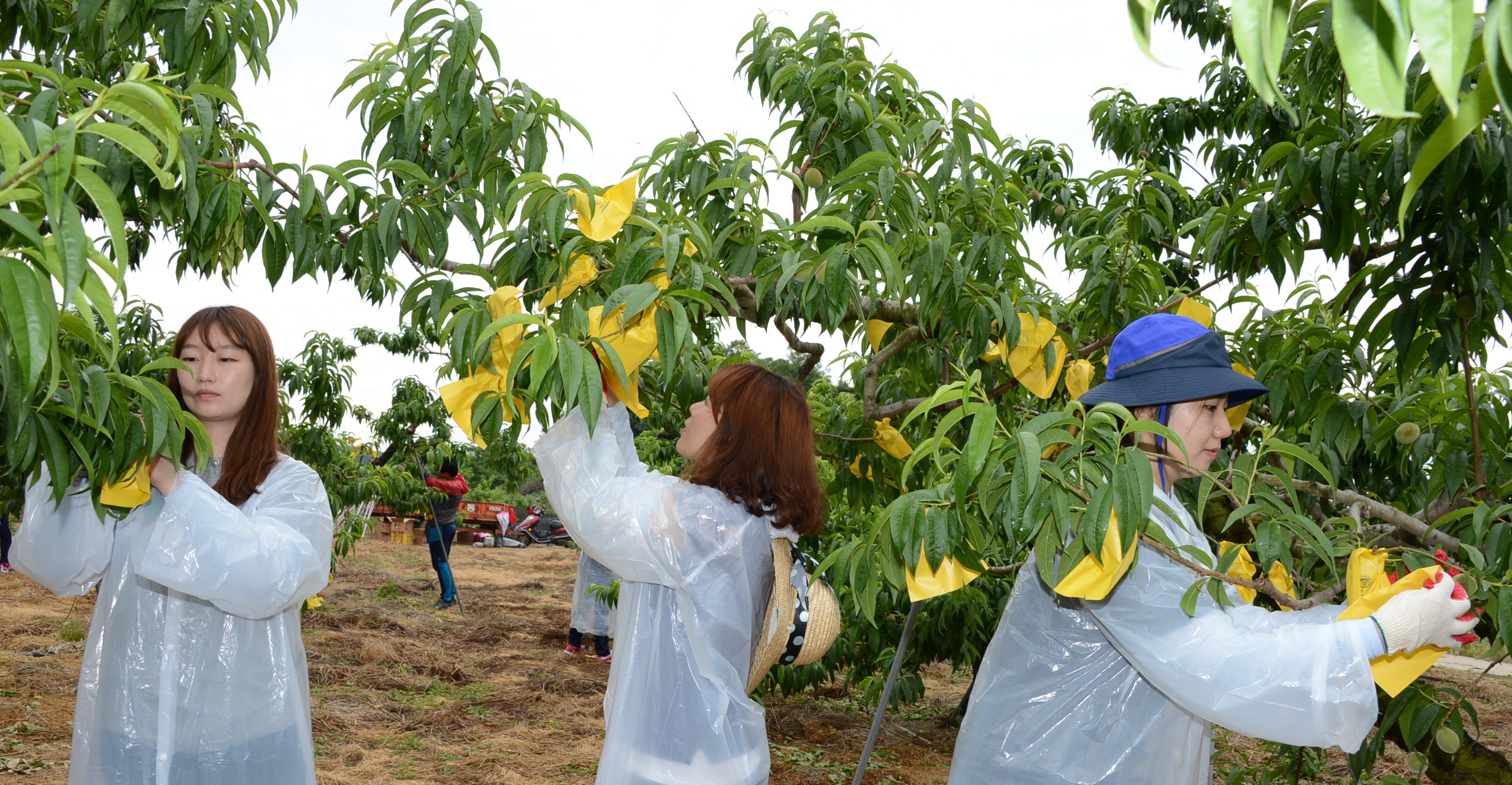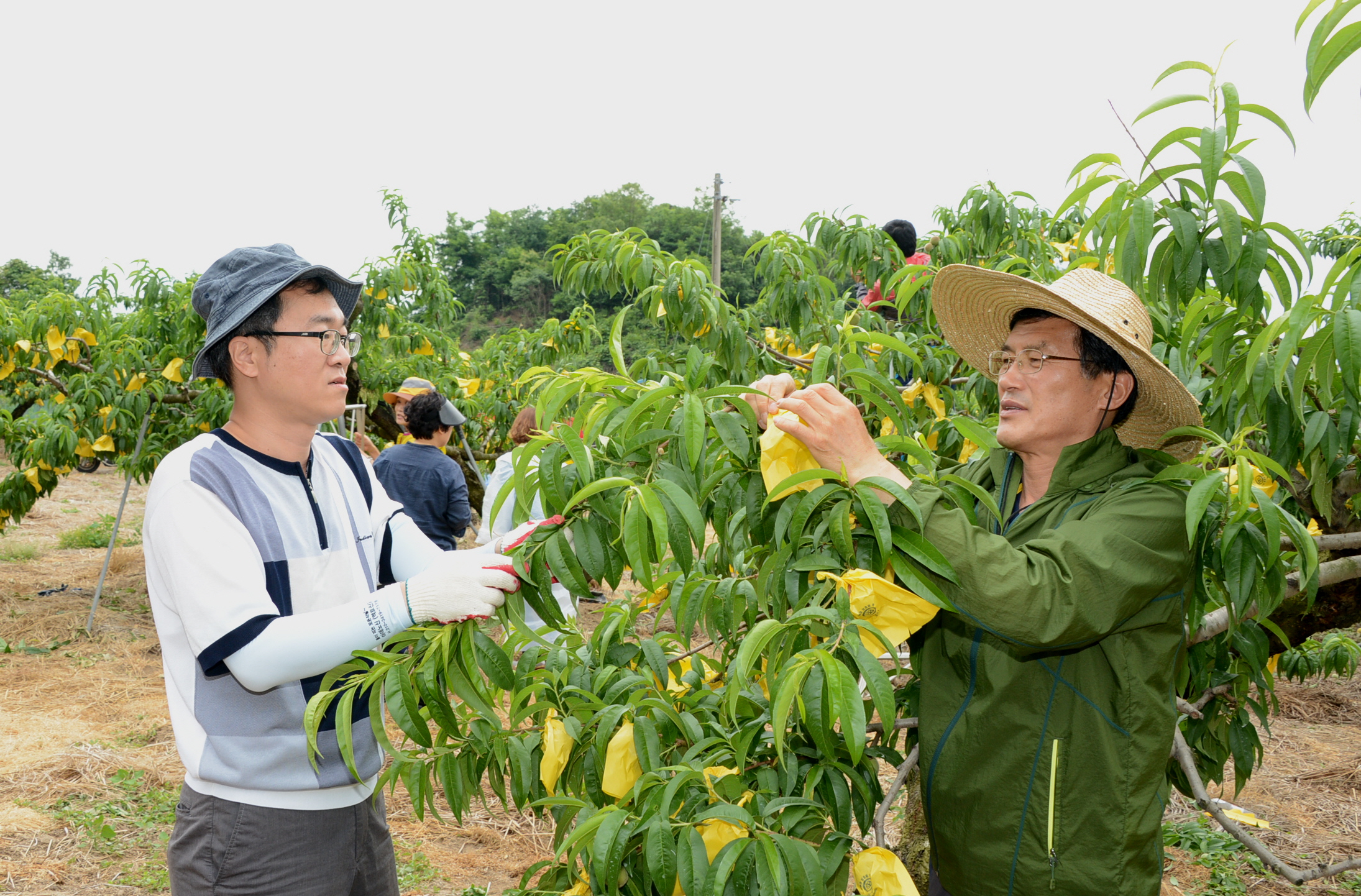 증평군은 5일 도안면 송정리 박철규씨 복숭아 밭에서 홍성열 군수를 비롯한 공무원 50여명이 참여한 가운데 농촌인구 감소 및 고령화 등으로 노동력 확보에 어려움을 겪는 농가의 적기 안정 영농 추진을 위해 ‘농촌일손돕기’를 실시했다.[보도 자료실 참조]