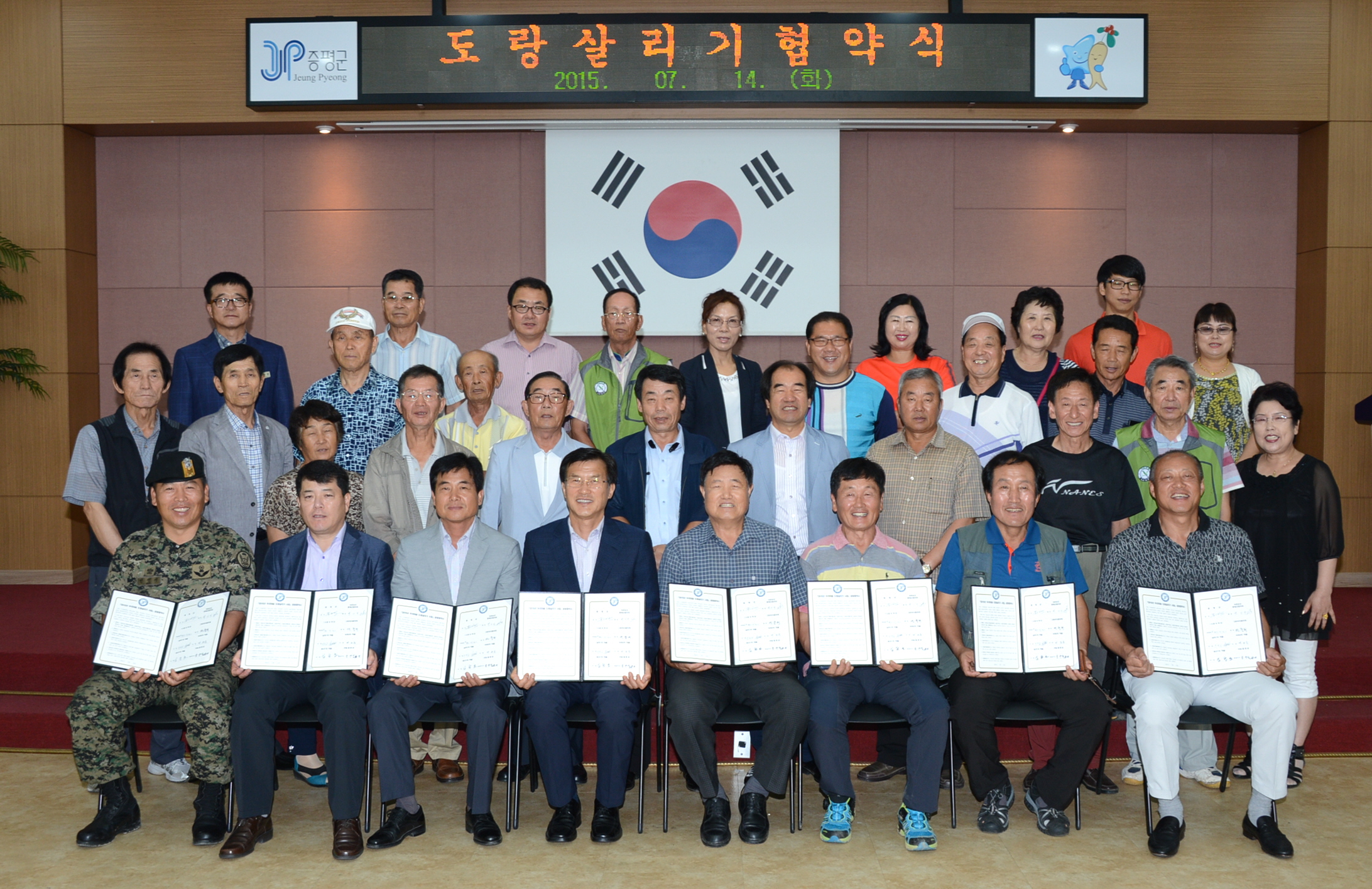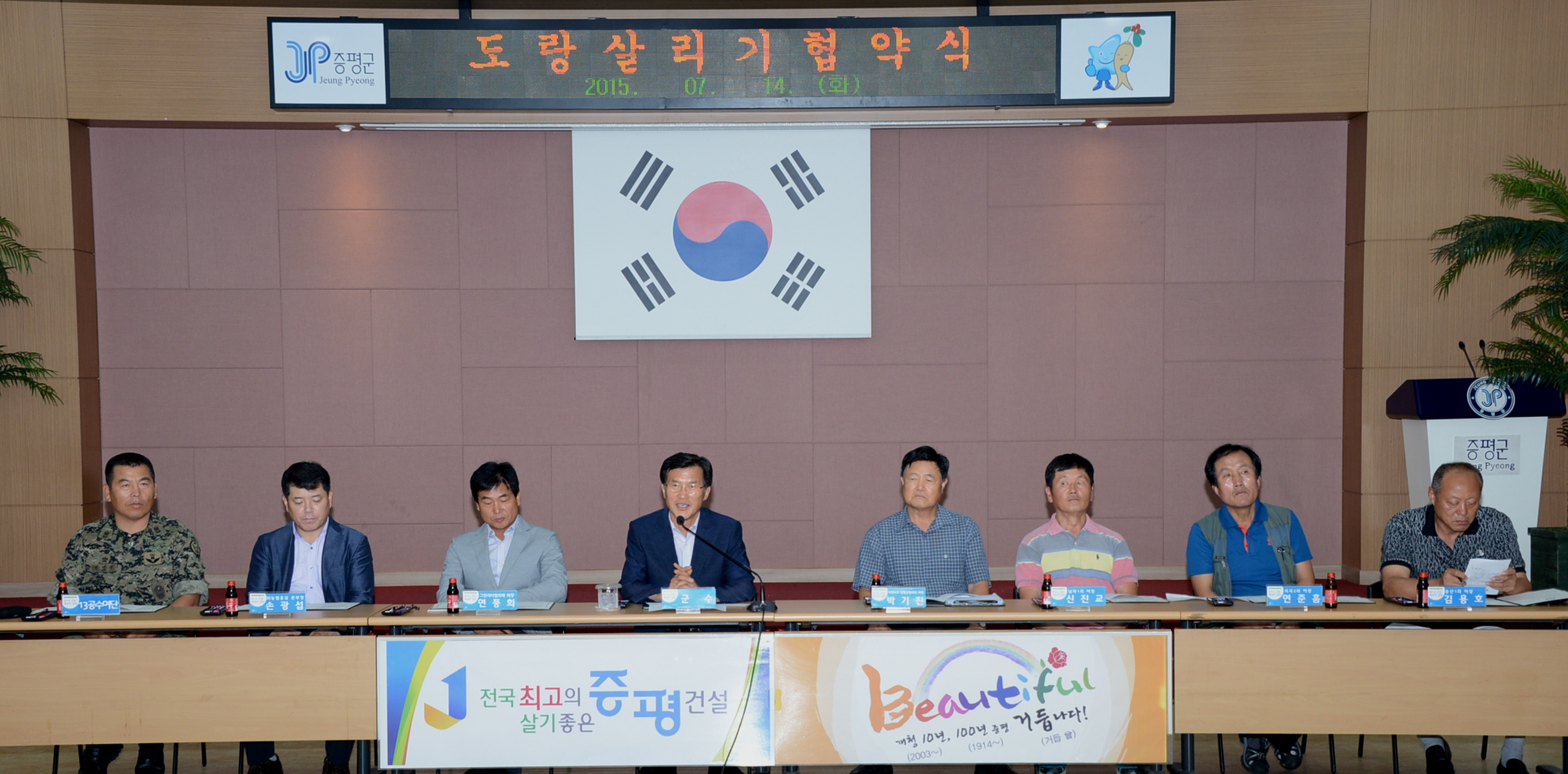 증평군은 14일 오전 10시 군청 대회의실에서 홍성열 증평군수 ,박기진 자연보호 증평군협의회장, 연풍희 그린리더협의체 회장, 허길용 13공수여단 참모장 등 8개 기관․ 사회단체가 참석한 가운데‘2015년 우리마을 도랑살리기 사업 협약식’을 체결했다.(보도자료실 참조)