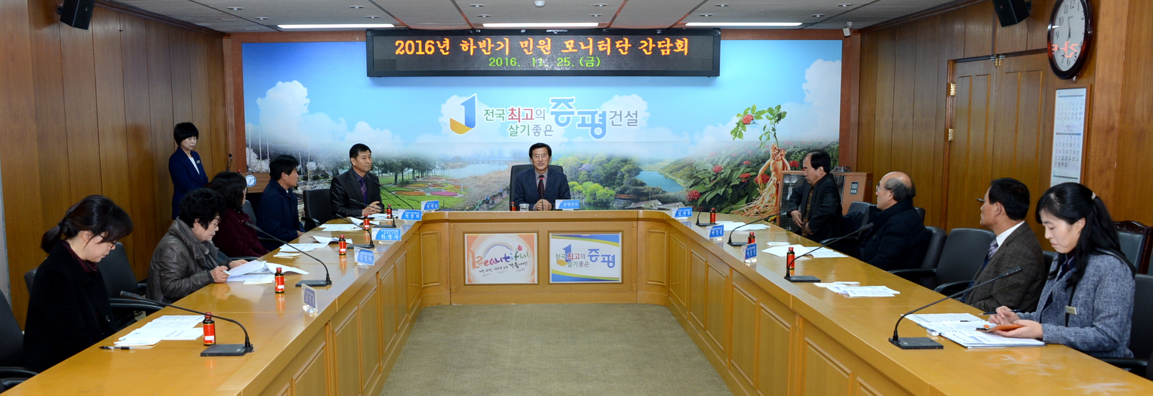 증평군은 25일 군청 소회의실에서 민원 모니터단과 관계공무원이 참석한 가운데 2016년 하반기 민원모니터단 간담회를 개최했다.[보도자료실 참조]