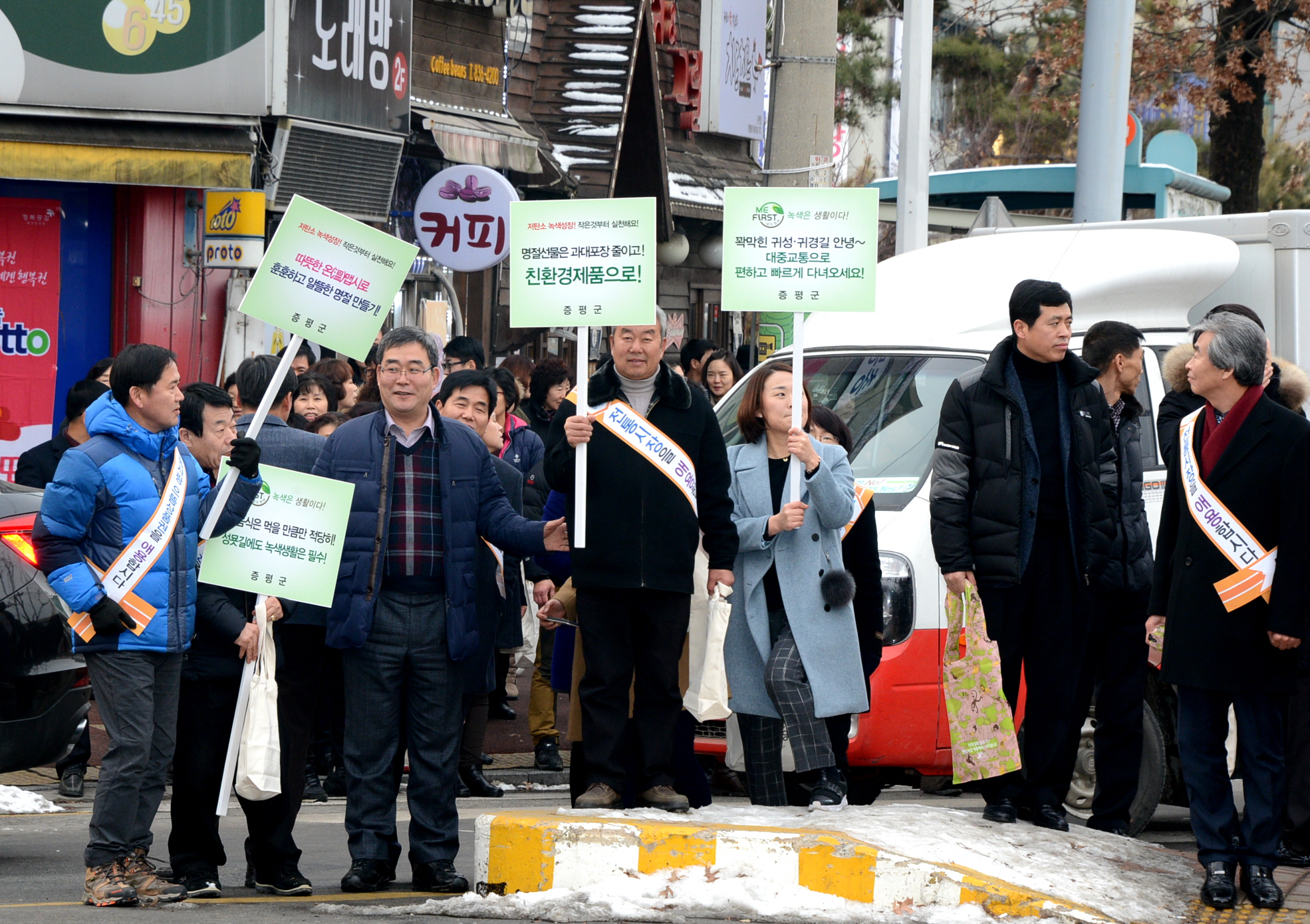 증평군은 민족 대명절인 설을 앞두고 26일 증평 장뜰시장에서 그린리더협의체와 관내 기관·단체가 참여한 가운데‘친환경 명절보내기’캠페인을 실시했다.[보도자료실 참조]