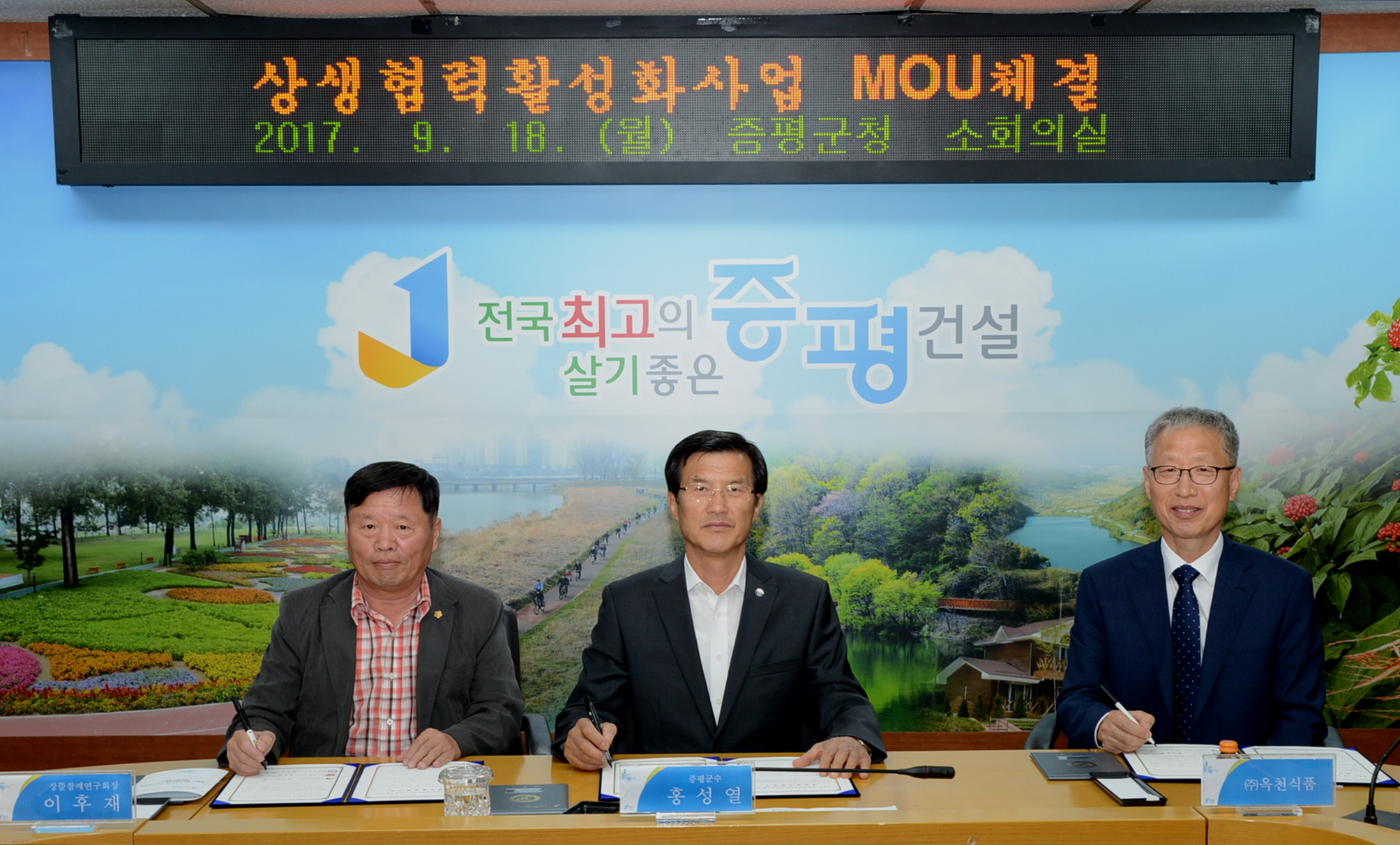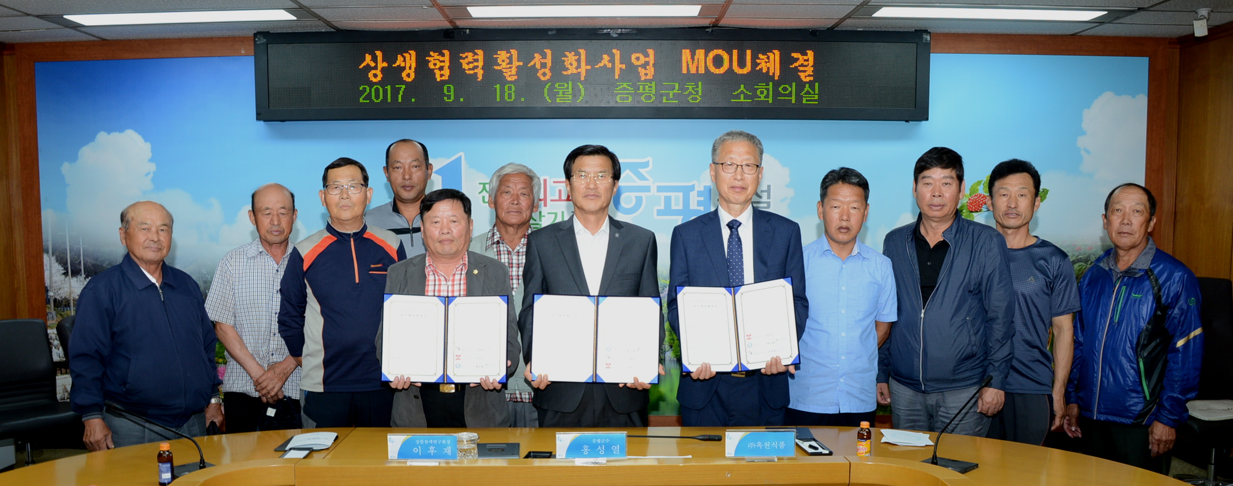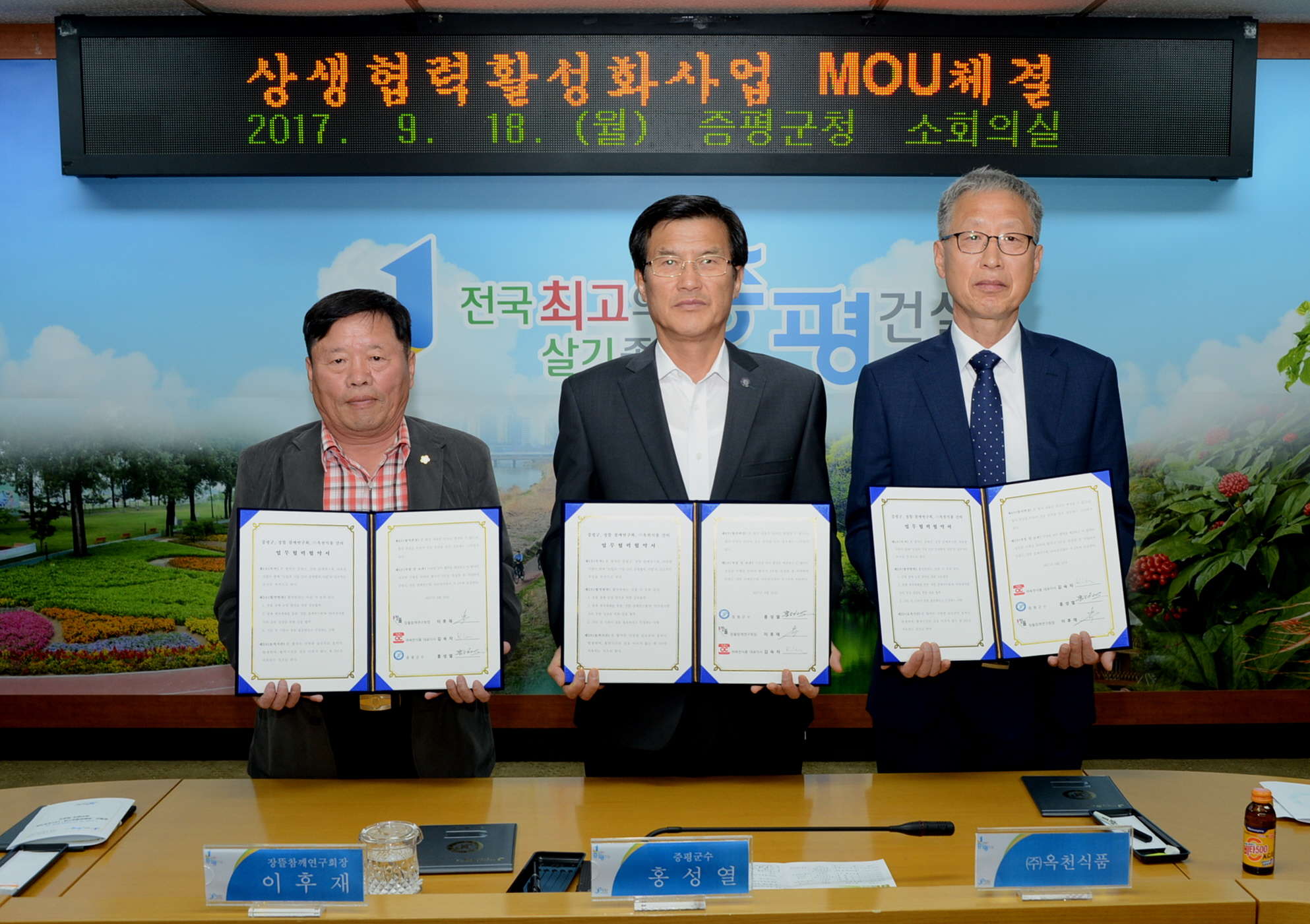 증평군은 18일 군청 소회의실에서 장뜰참깨연구회(대표 이후재), ㈜옥천식품(대표 김숙자)와 상생발전을 위한 3자 업무협약을 체결했다.(보도자료실 참조)