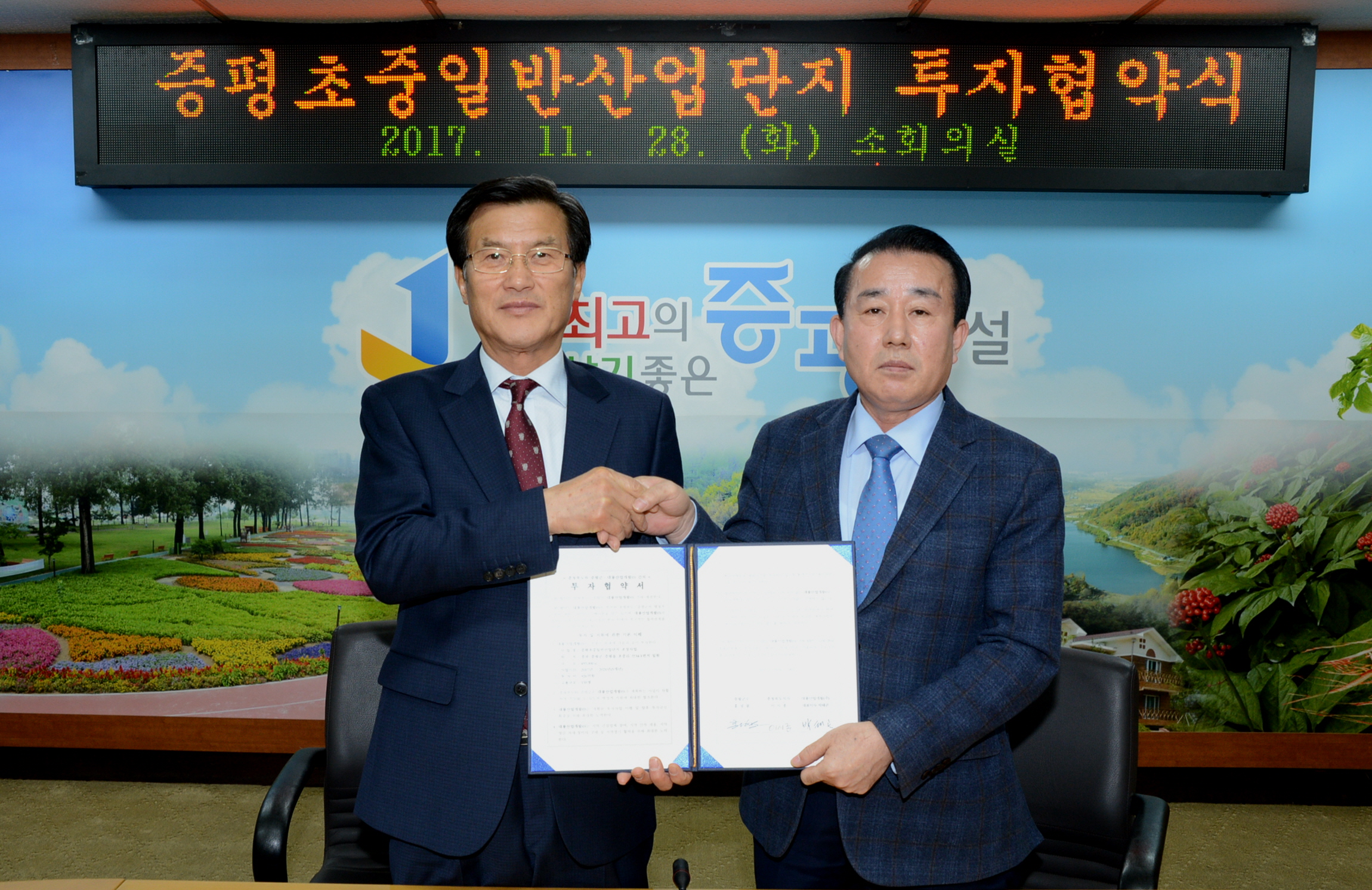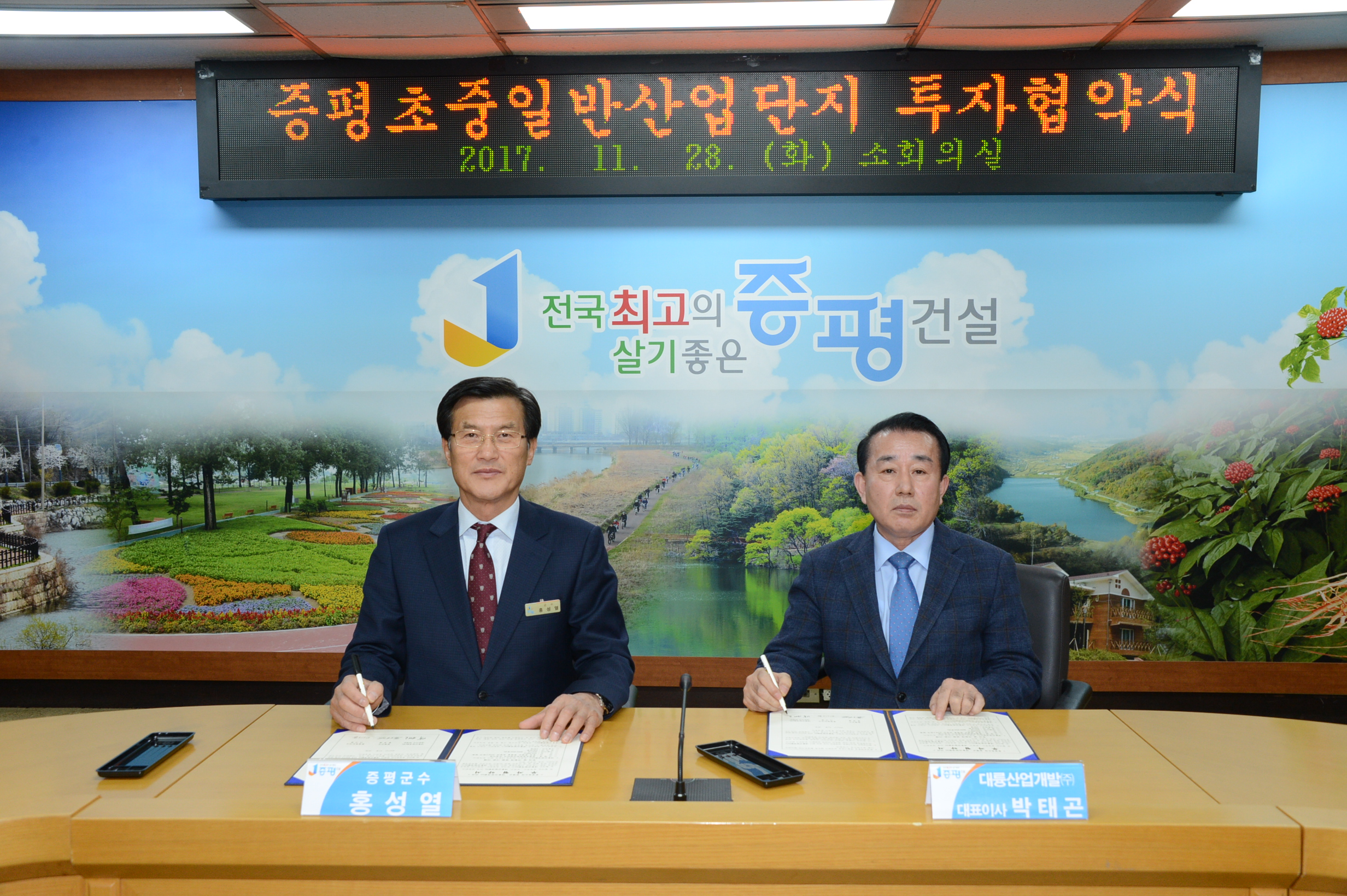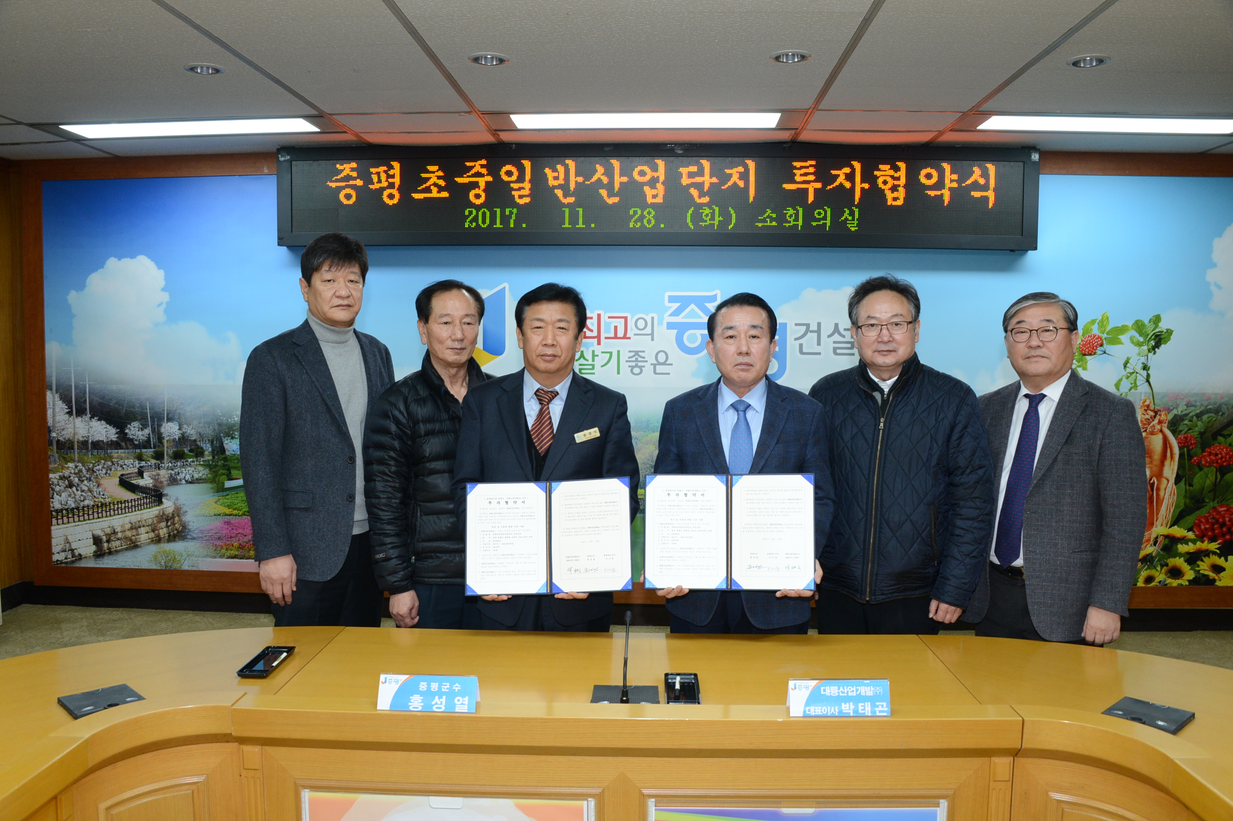 충청북도와 증평군은 28일 군청 소회의실에서 대륭산업개발(주)과 증평초중일반산업단지 조성사업 투자협약을 체결했다.[보도자료실 참조]