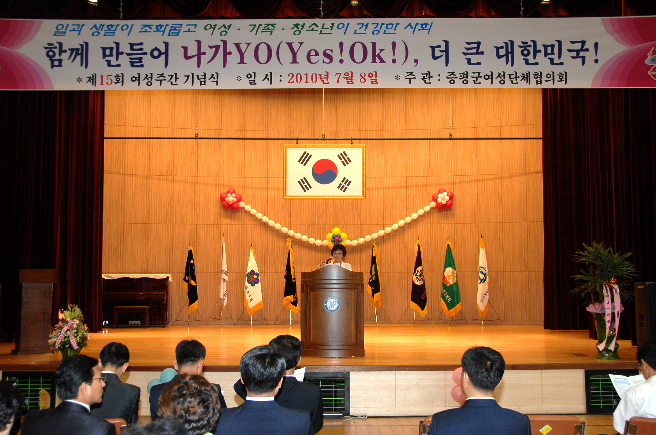 제15회 증평군 여성주간 기념행사가 8일 오후 1시 30분 홍성열 군수, 김재룡 군의장을 비롯한 기관단체장을 비롯해 지역 내 여성단체 회원들과 지역주민 등이 참석한 가운데 청소년수련관에서 열렸다. [보도자료실 참조]
