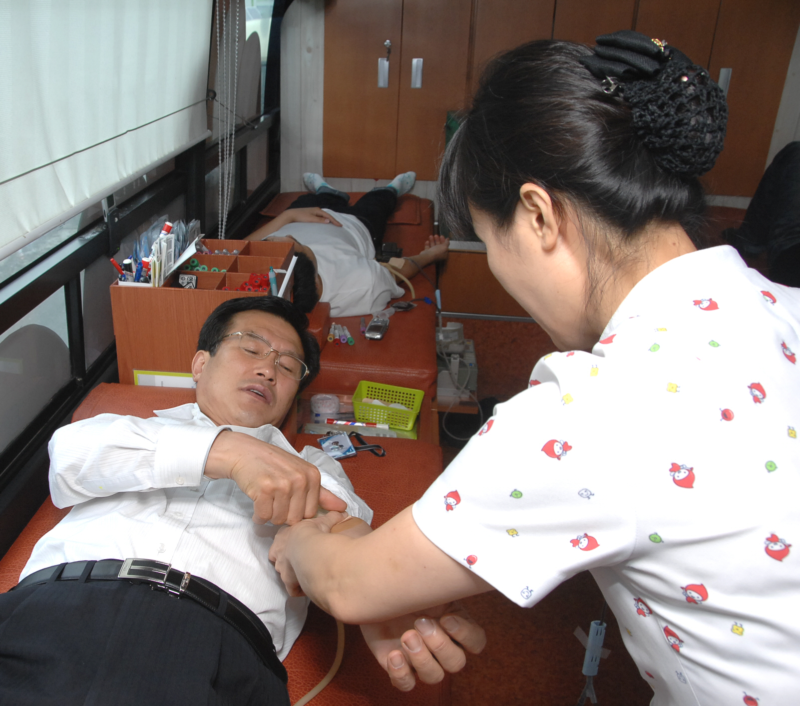홍성열 증평군수를 비롯한 증평군 공무원 50여명은 16일 오전 10시부터 군청 앞 광장 헌혈버스에서 사랑의 헌혈운동을 전개하고 작은 실천·큰 사랑을 나눴다.[보도자료실 참조. 사진은 홍성열군수가 헌혈하는 모습]