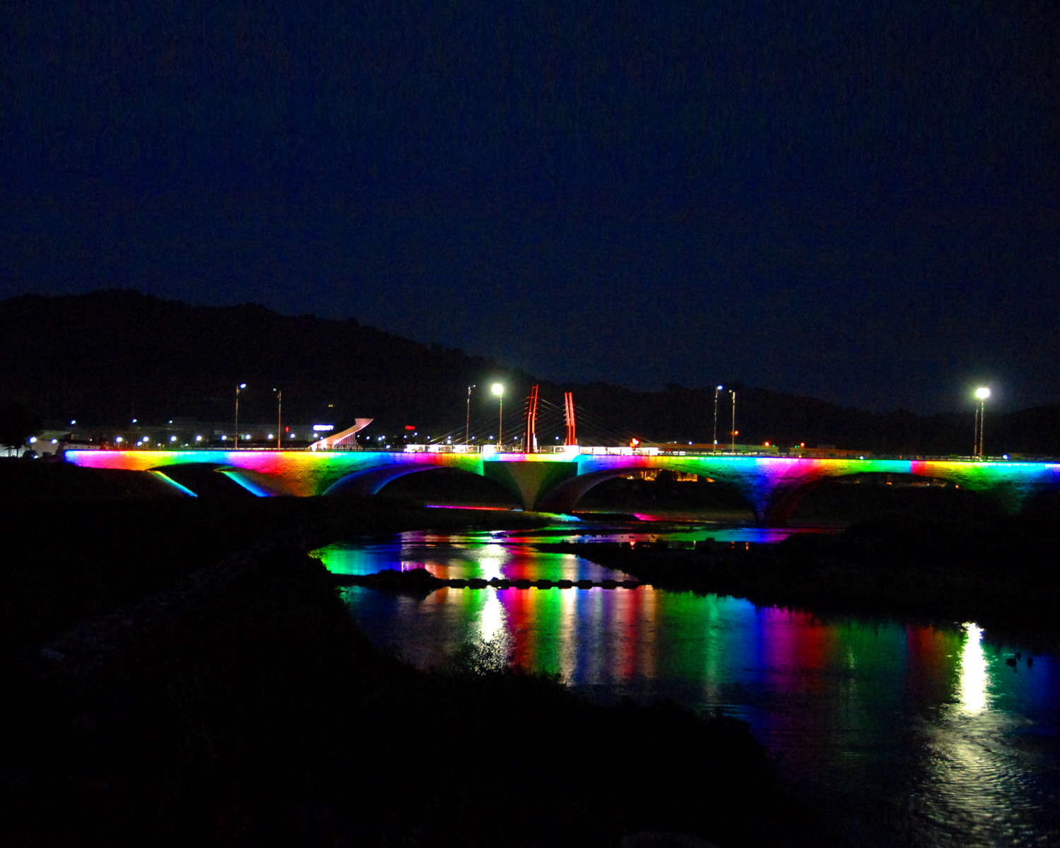 증평군에서는 그동안 논란이 되었던 증평읍 장동리와 미암리를 연결하는 보강천 횡단 교량명칭을 “장미대교”로 최종 확정했다. 사진은 장미대교의 낮과 밤에 모습을 같은 장소에서 비교해서 찍은 사진 [증평포커스 참조]