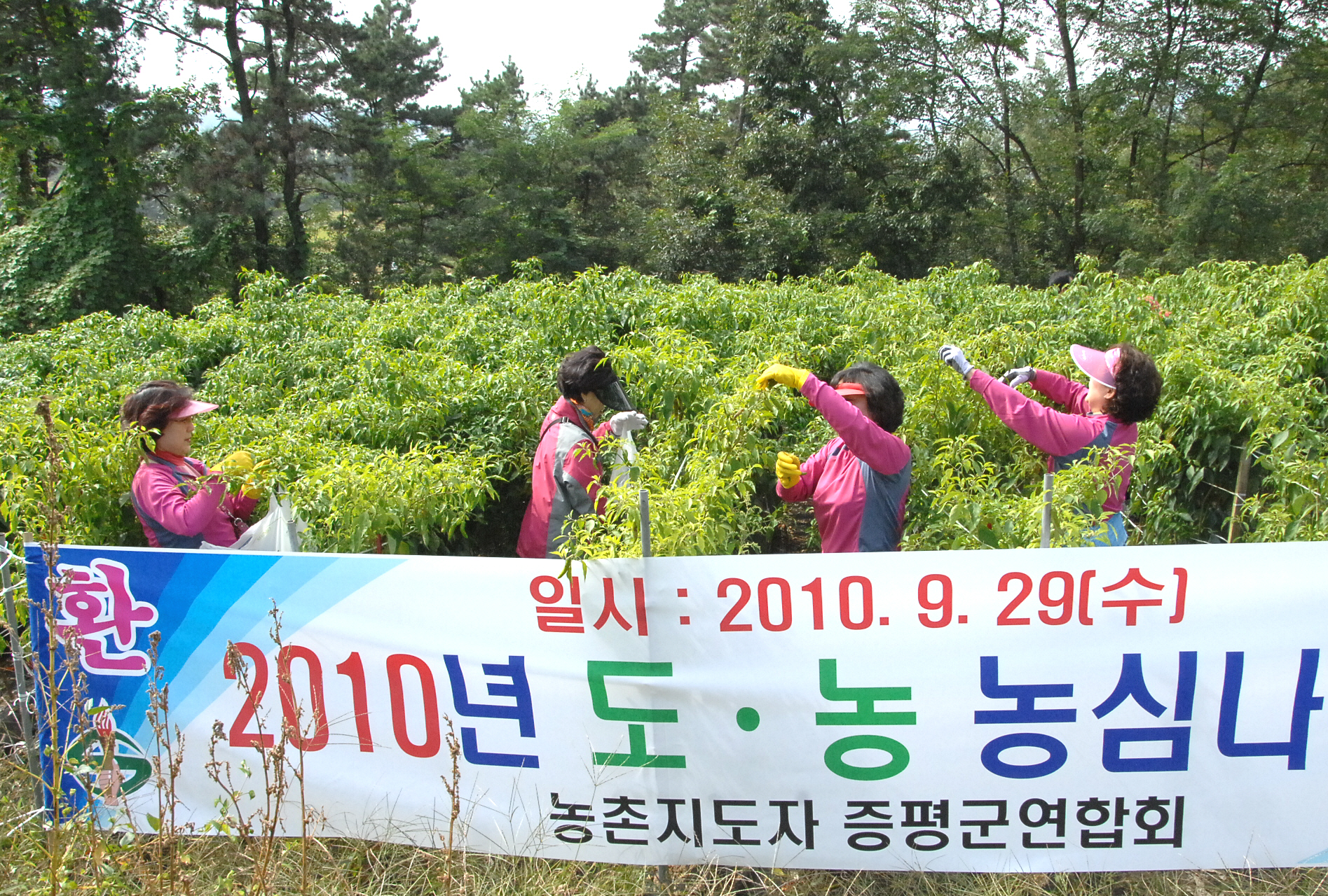 증평군 농업기술센터(소장 김동구)는 29일 오전 11시 기술센터농업인문화관 대회의실에서 농촌지도자회원 및 도시 소비자, 관계자 등 50여명이 참석한 가운데 ‘도.농연대 농심나누기’ 행사를 가졌다. 사진은 도시소비자들이 증평읍 사곡리에서 고추(지고추)따기를 하는 모습이다.[보도자료실 참조]