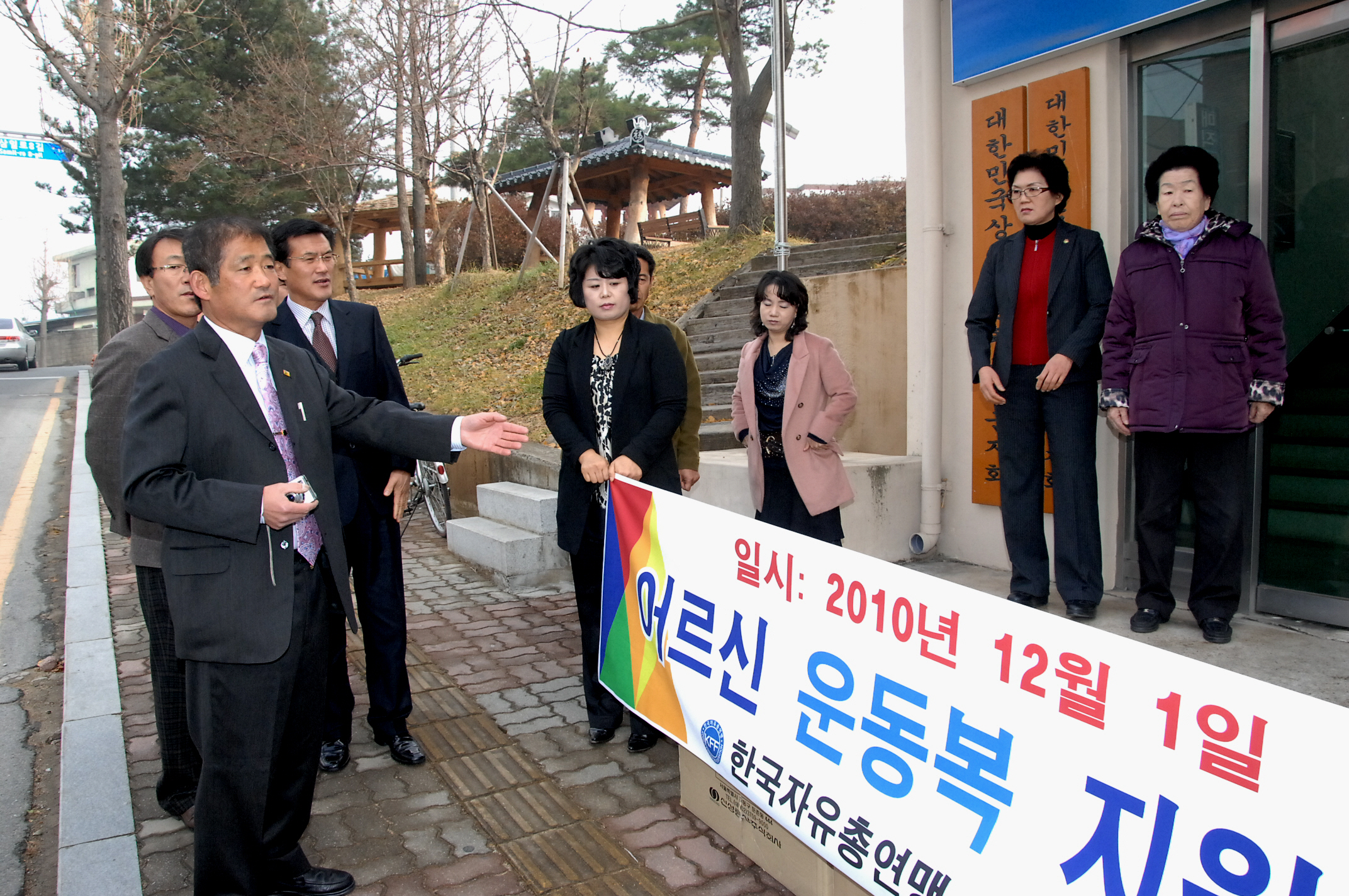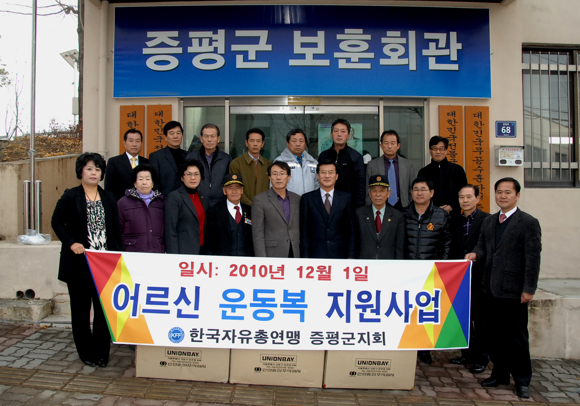 자유총연맹증평군지부(지부장 김덕중)는 1일 오전 11시30분과 12시에 증평군 노인지회 사무실에 운동복 60벌과 보훈회관 방한복 30벌 등 총 90벌의 의류를 각각 어르신들께 전달했다. [보도자료실 참조]