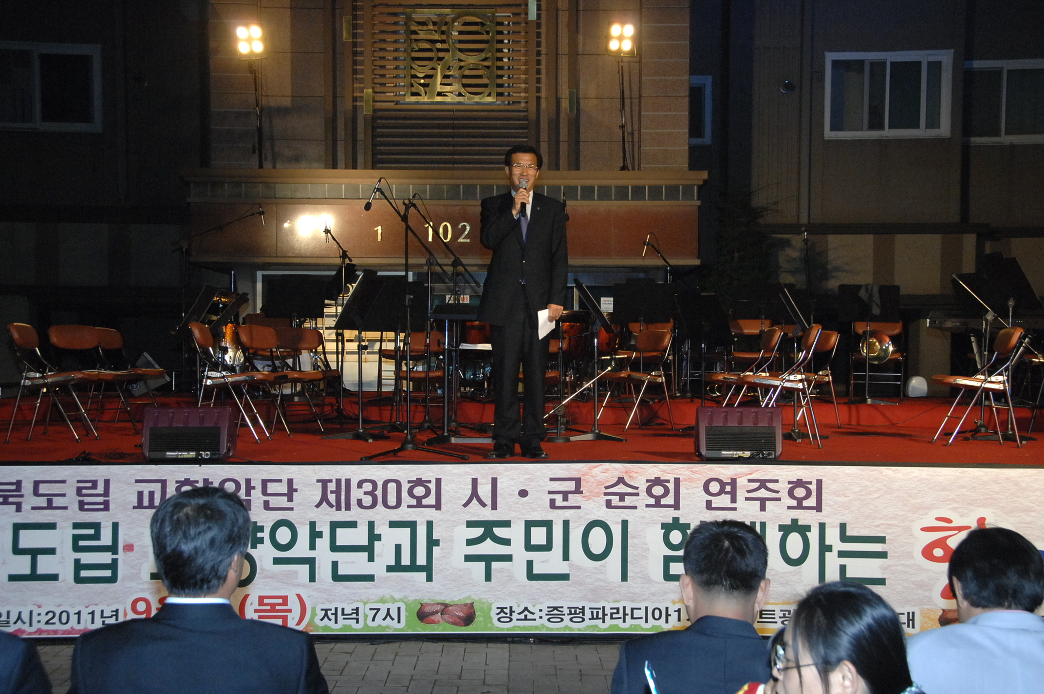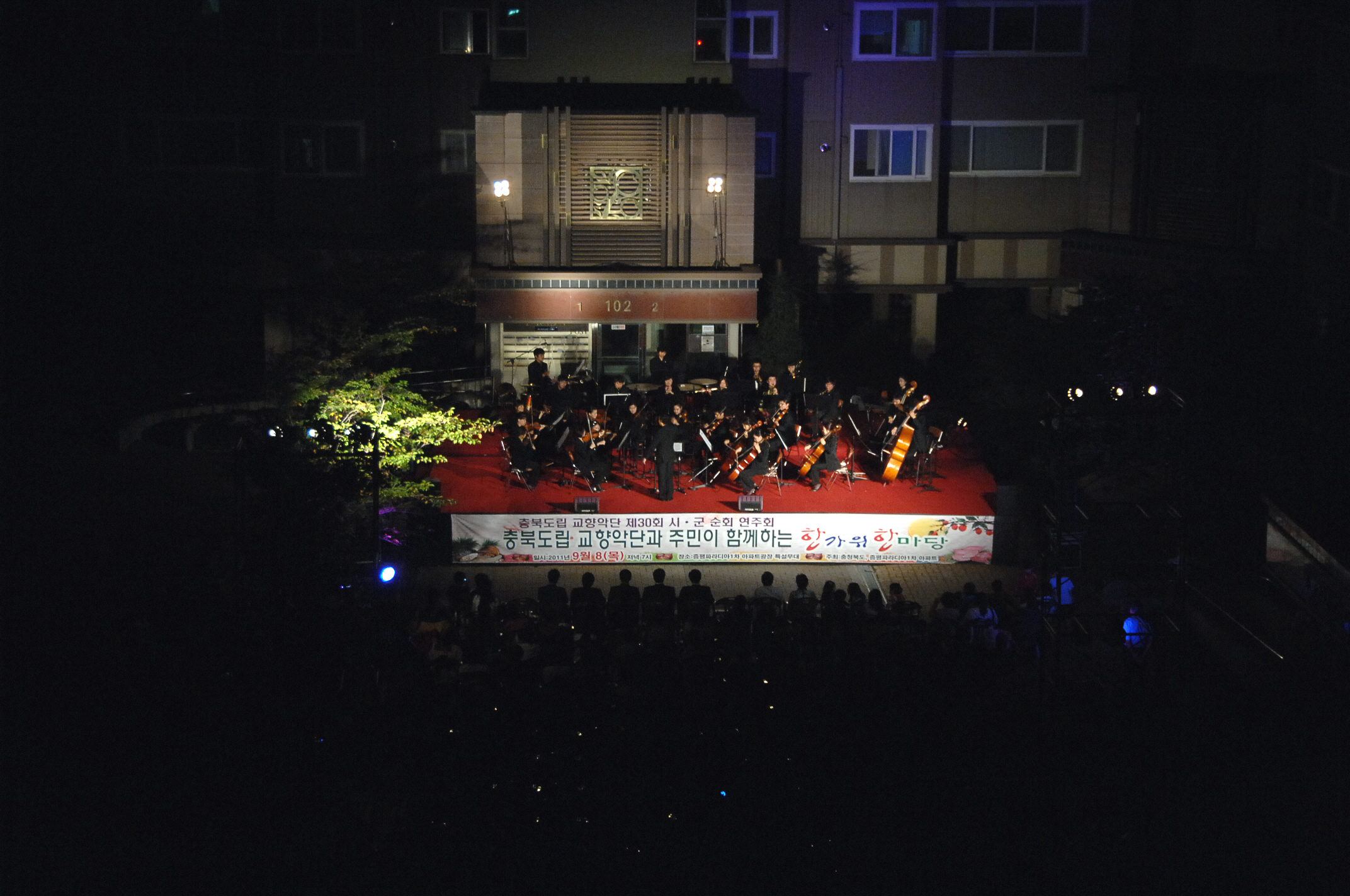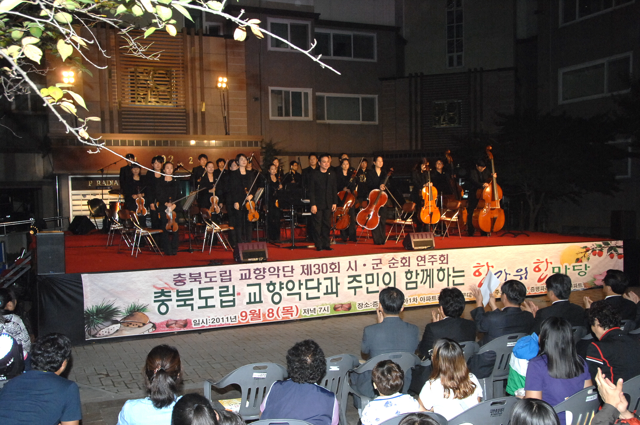 충북도립 교향악단과 주민이 함께하는 한가위 한마당 공연이 8일 저녁7시 파라다이 1차 아파트광장 특설무대에서 홍성열 군수, 김재룡 군의장, 김봉회 도의원, 이근영 입주자 대표를 비롯한 기관단체장과 입주민. 인근 지역 주민 등 500여명이 참석한 가운데 성황리에 종료 되었다.