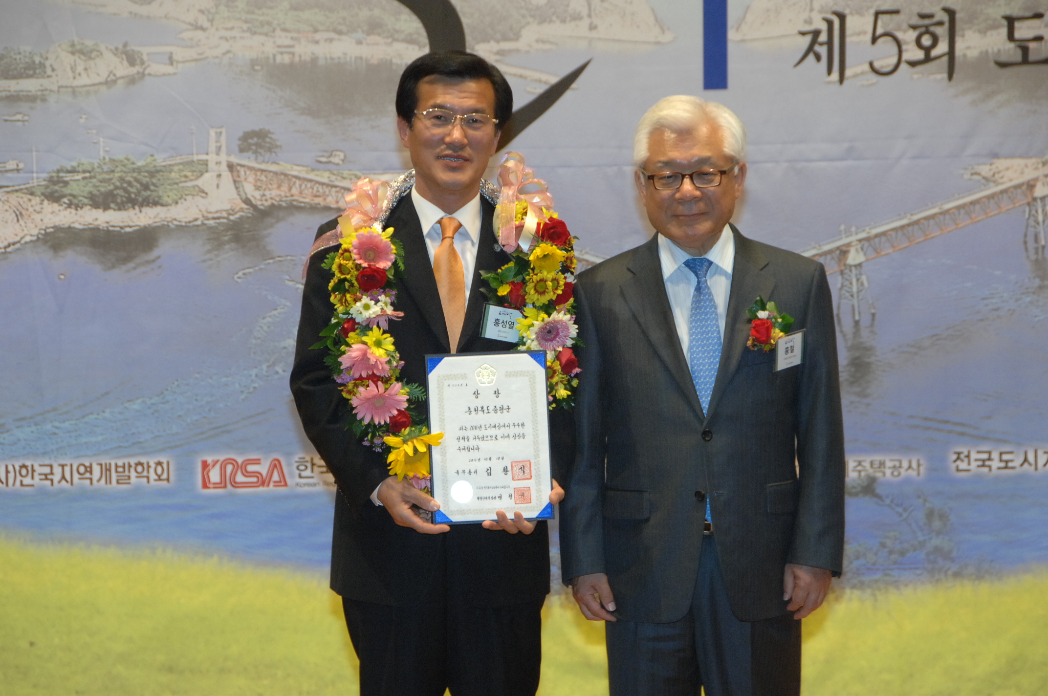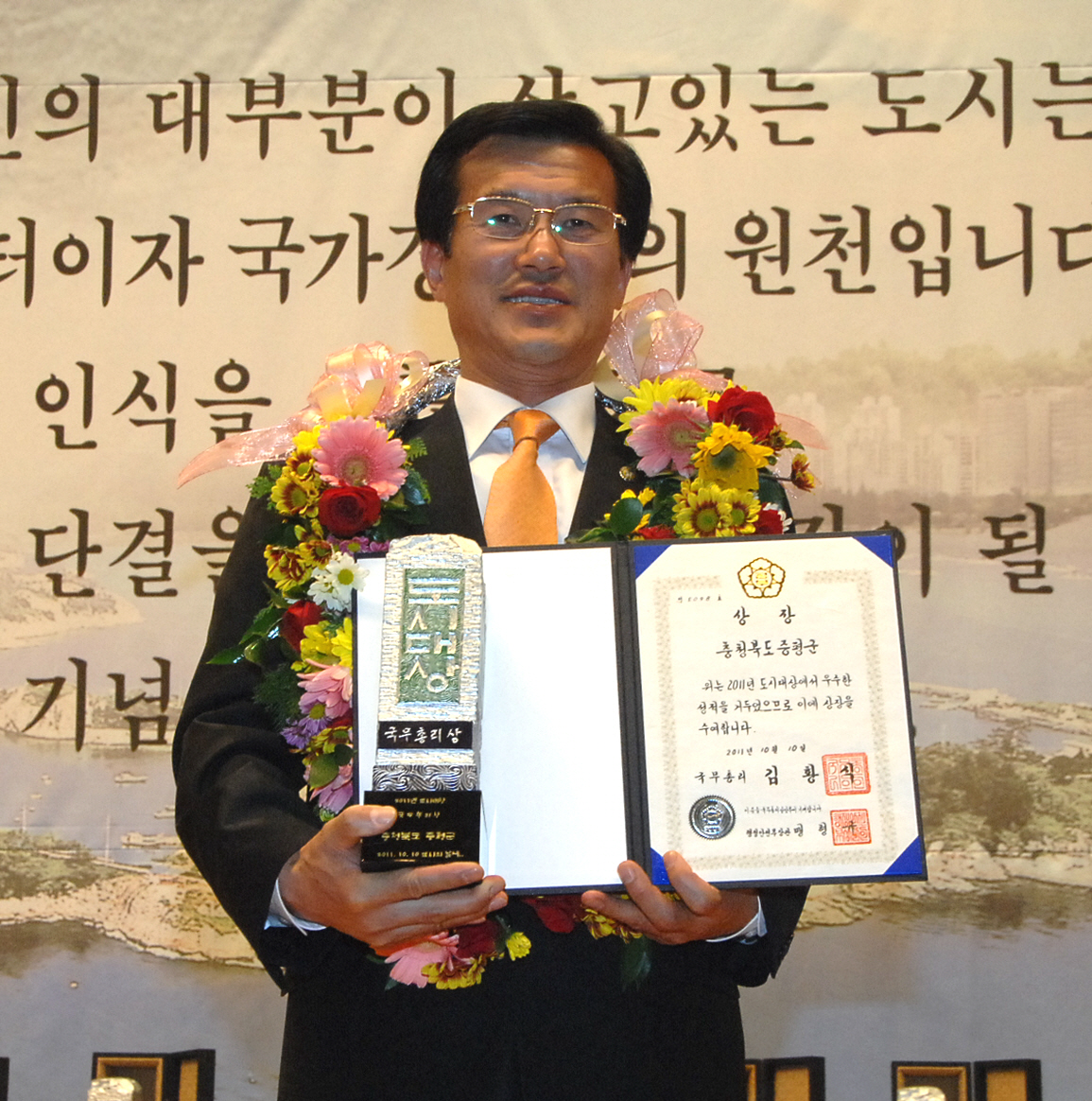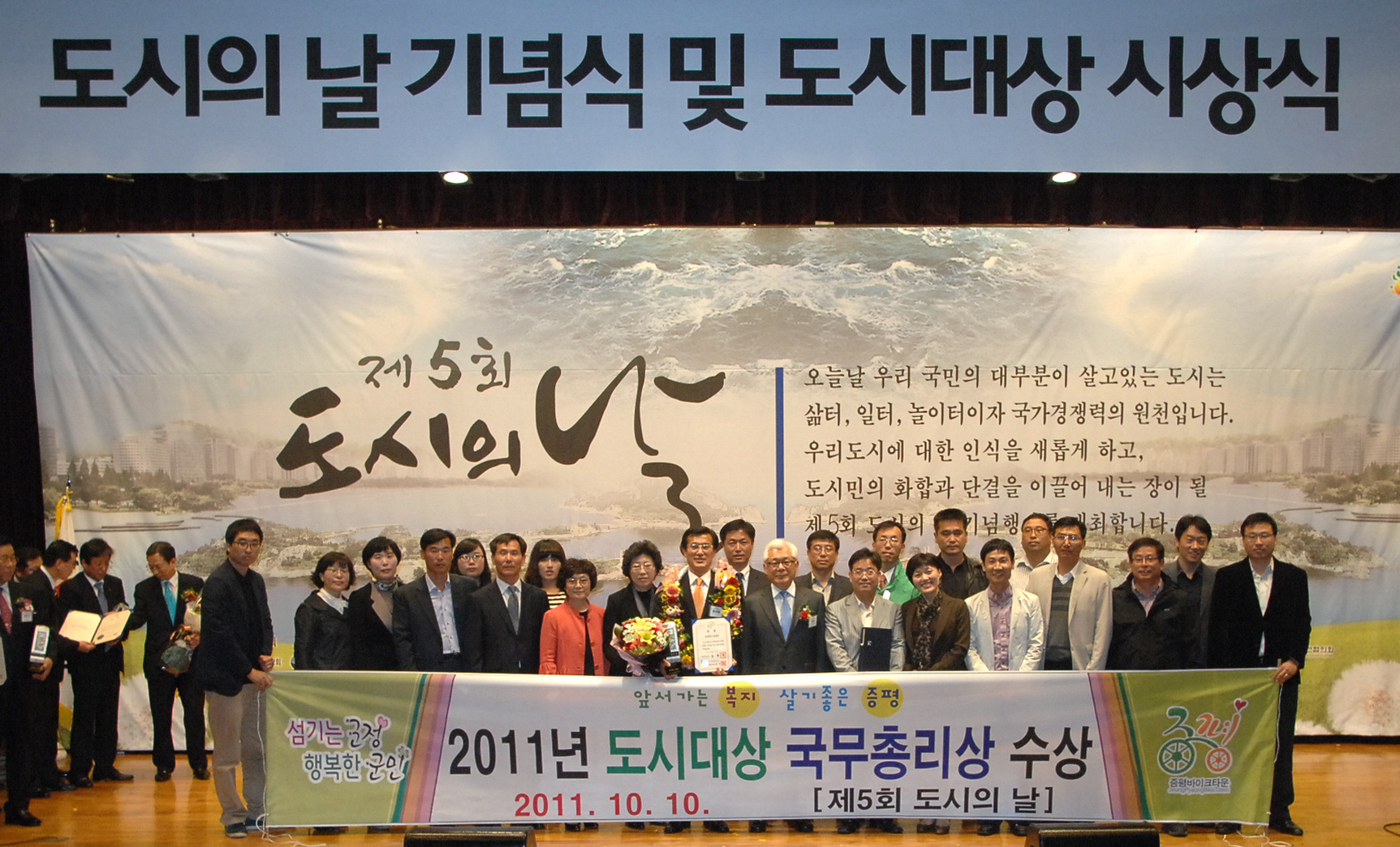 증평군은 지난달 29일 행정안전부에서 주최한 대한민국 지방자치경영대전에서 복지서비스 부문 최우수상을 수상한데 이어 10일 군산시청에서 열린 제5회 2011년 도시대상 시상식에서 국무총리상을 수상해 겹경사를 맞았다.[보도자료실 참조]
