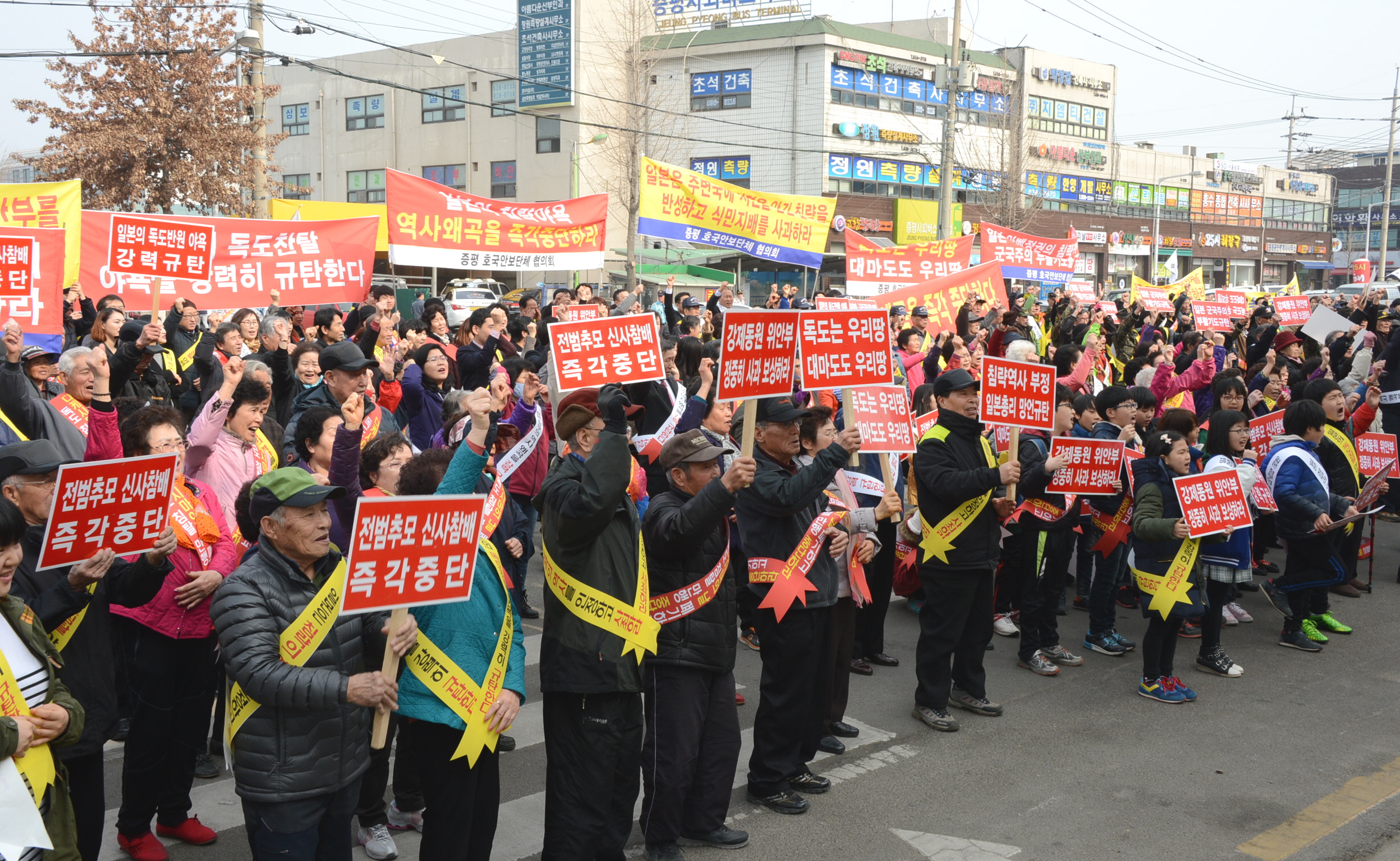 최근 독도영유권 도발 및 야스쿠니 신사참배 동조, 안중근 의사 테러리스트 발언 등 각종 망언과 우경화로 치닫고 있는 아베정부를 규탄하기 위한 대규모집회가 28일 오후2시 증평군호국안보협의회(회장 육재동) 주관으로 회원 1000여명이 참석한 가운데 증평군청 민원실 앞에서 개최됐다. [보도자료실 참조]