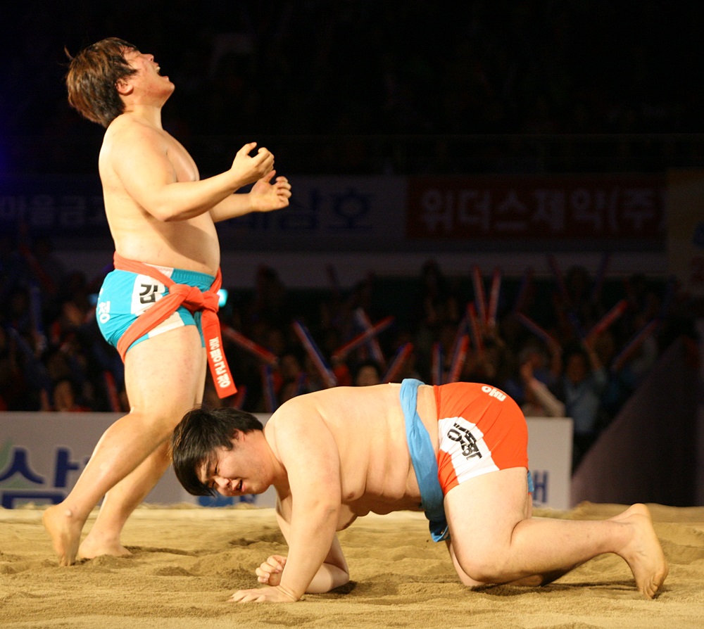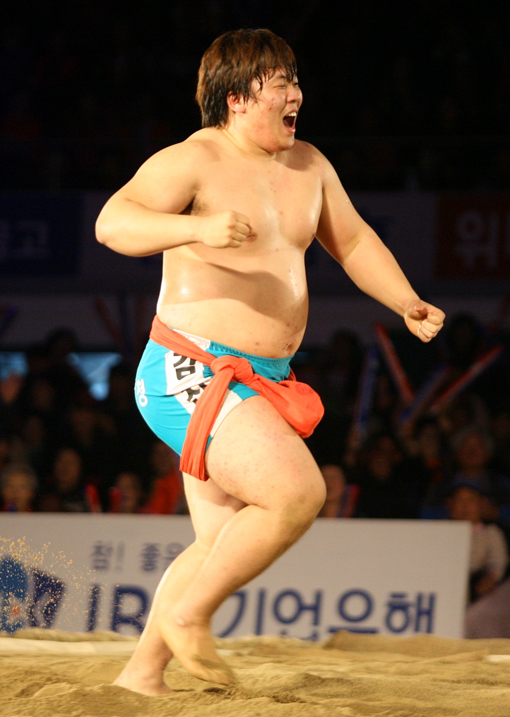 증평군청인삼씨름단 소속 김진이 30일 충청북도 보은군 보은국민체육센터에서 열린 "IBK기업은행 2014 보은장사씨름대회‘ 마지막 날 백두장사(150kg이하) 결정전(5판3선승제)에서 이재혁(울산동구청)을 3-0으로 물리치고 백두장사에 올랐다. [증평보도자료실 참조]