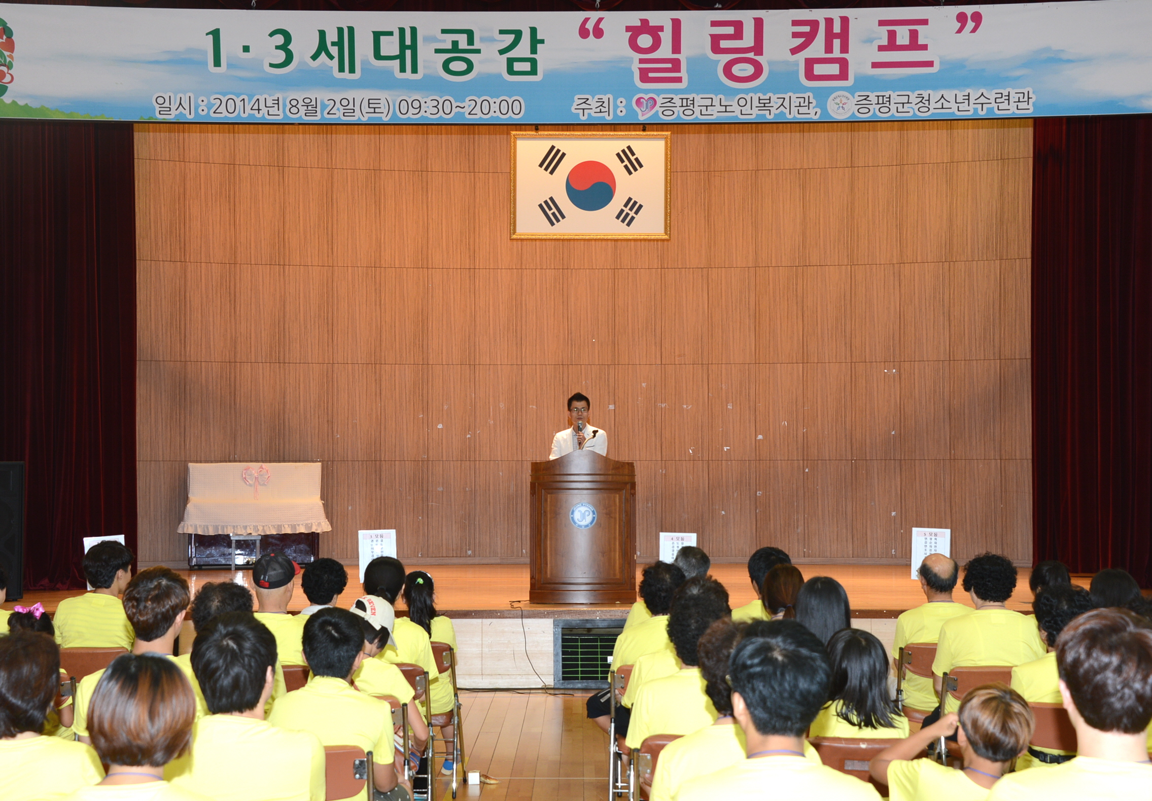 증평군노인복지관과 증평군청소년 수련관이 주관하는 1.3세대 공감사업 ‘힐링캠프’가 2일 증평군 청소년수련관 강당에서 홍성열 군수, 박영순 노인복지관장, 강경구 청소년수련관장을 비롯해 어르신 30명, 초등학생 30명, 봉사자 10명 등 70여명이 참여한 가운데 열렸다.[증평포토포커스 참조]
