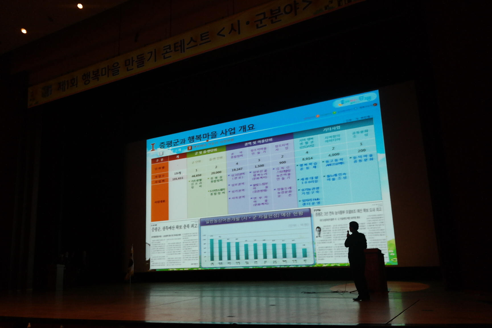 증평군(군수 홍성열)이 지난 6일부터 7일까지 1박 2일간 대전 충남대 정심화국제문화센터와 경기도 안성팜랜드에서 개최된 제1회 행복마을 만들기 콘테스트에서 시․군 분야에 참가해 농림축산식품부장관상을 수상했다. [증평보도자료실 참조]