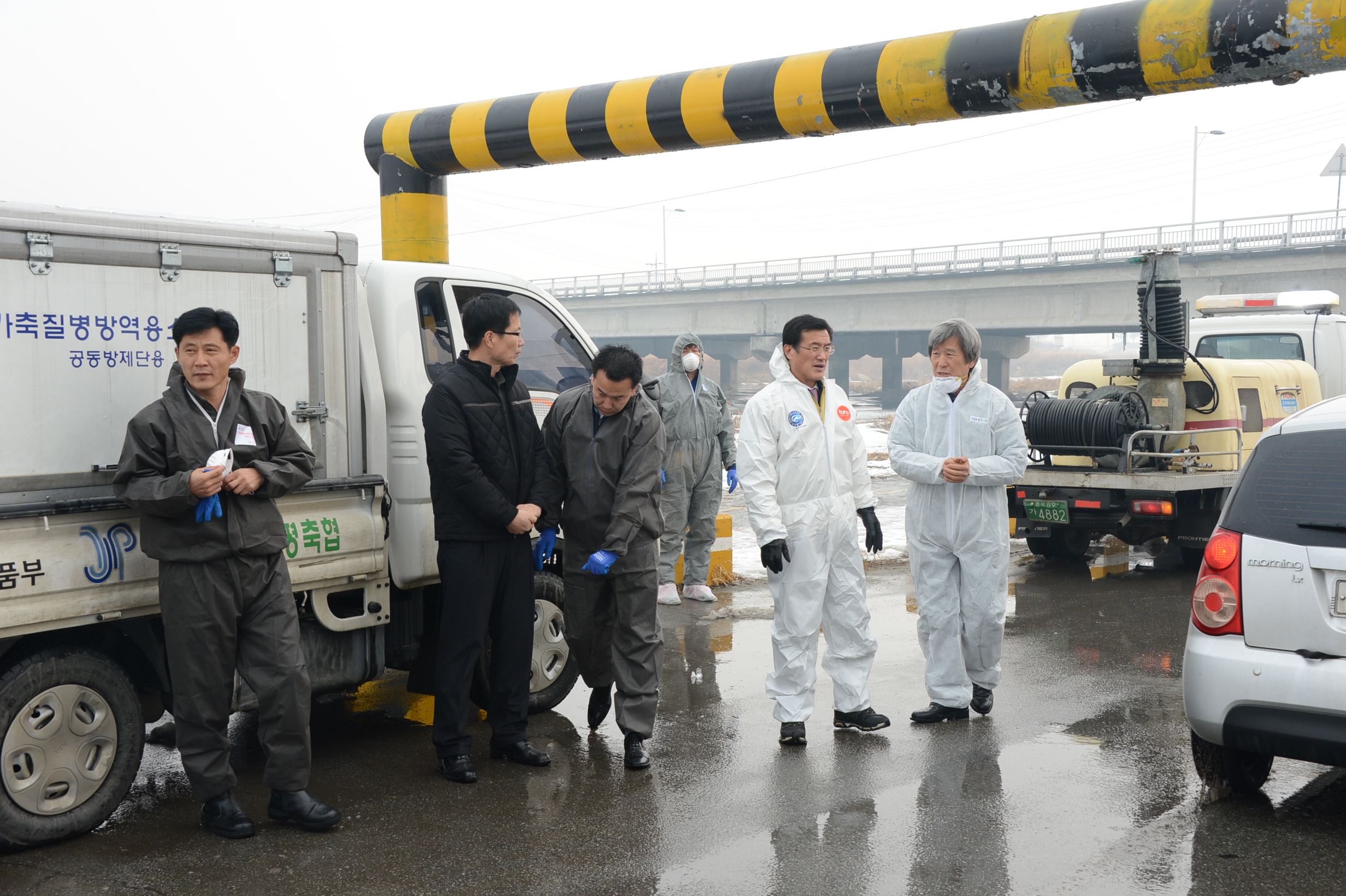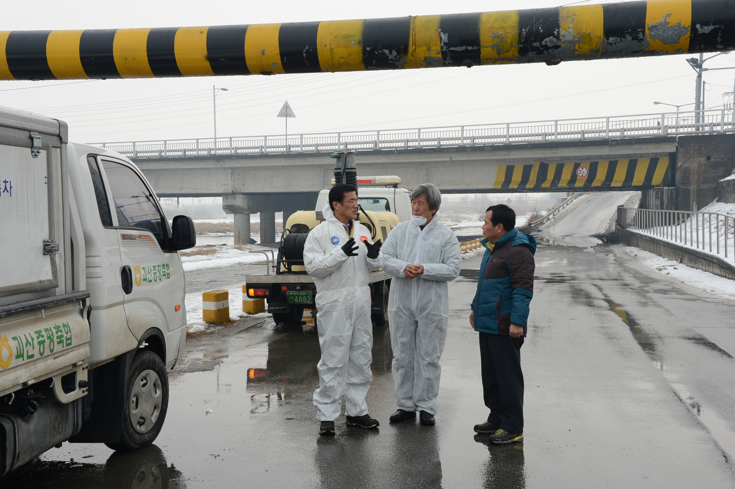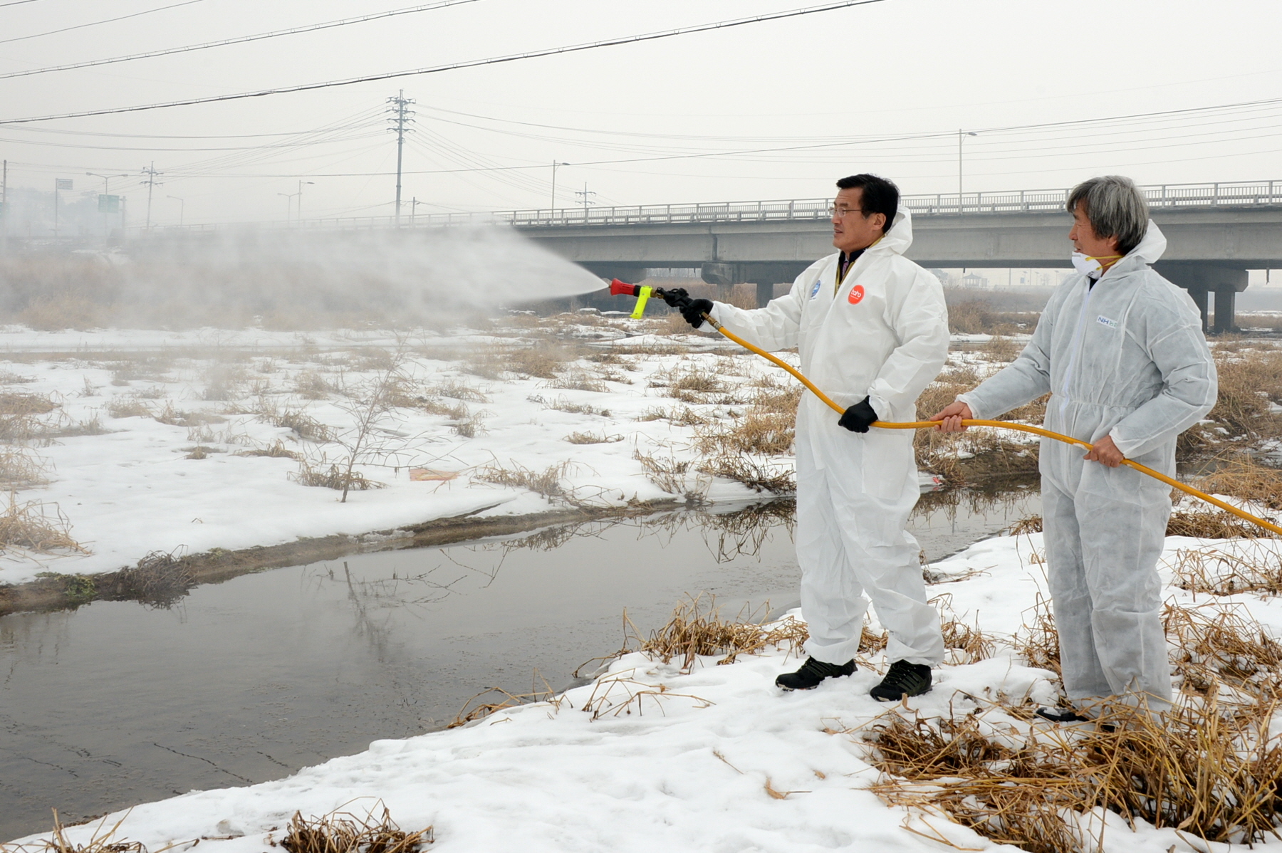 증평군이 최근 발생된 돼지 농가 구제역 및 증평 보강천 야생철새에서 AI 바이러스 검출에 따른 소독 등 방역 활동 강화에 나서고 있다. [보도자료실 참조. 사진은 홍성열군수가 보강천에서 방역활동을 하고 있는 모습]