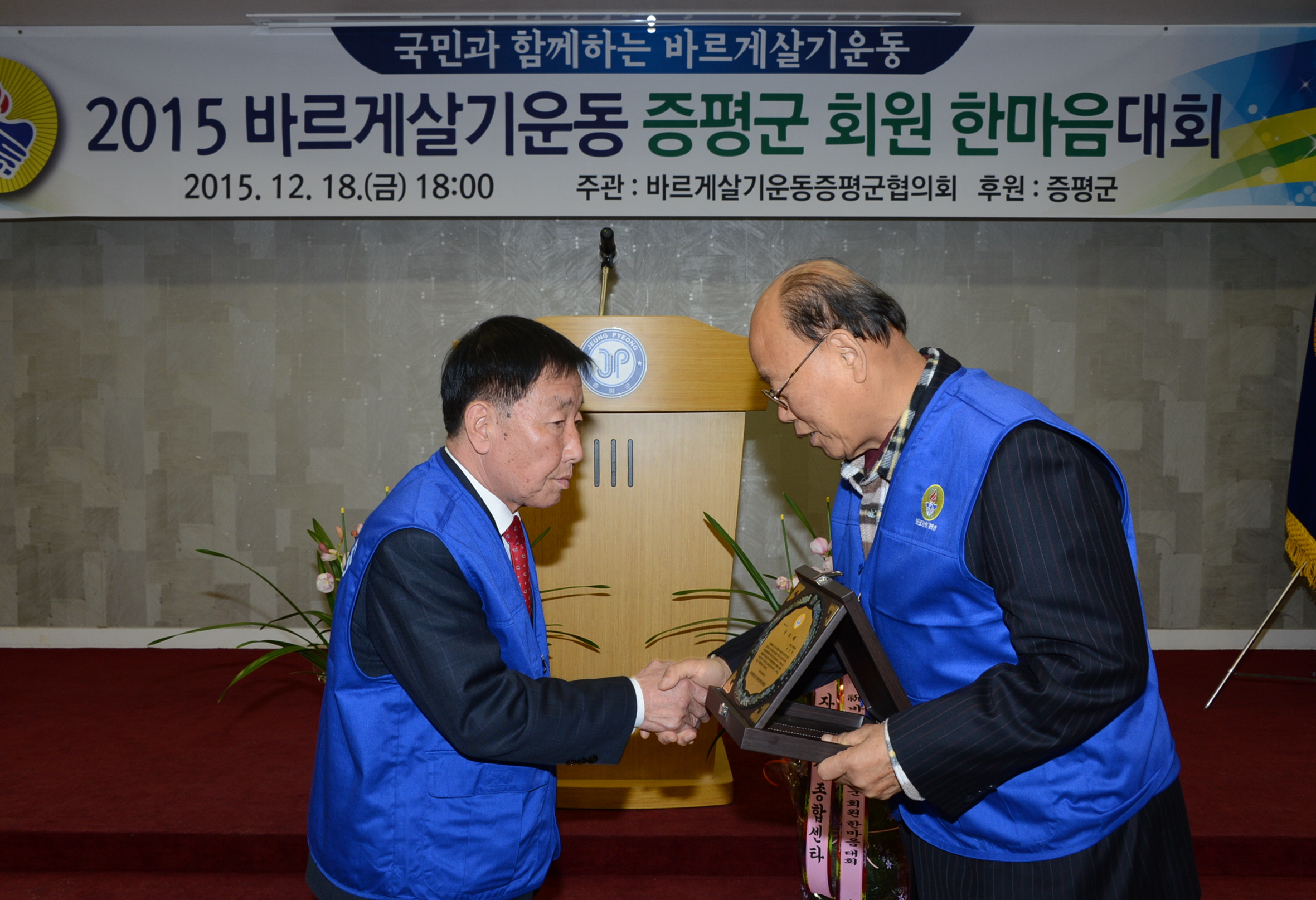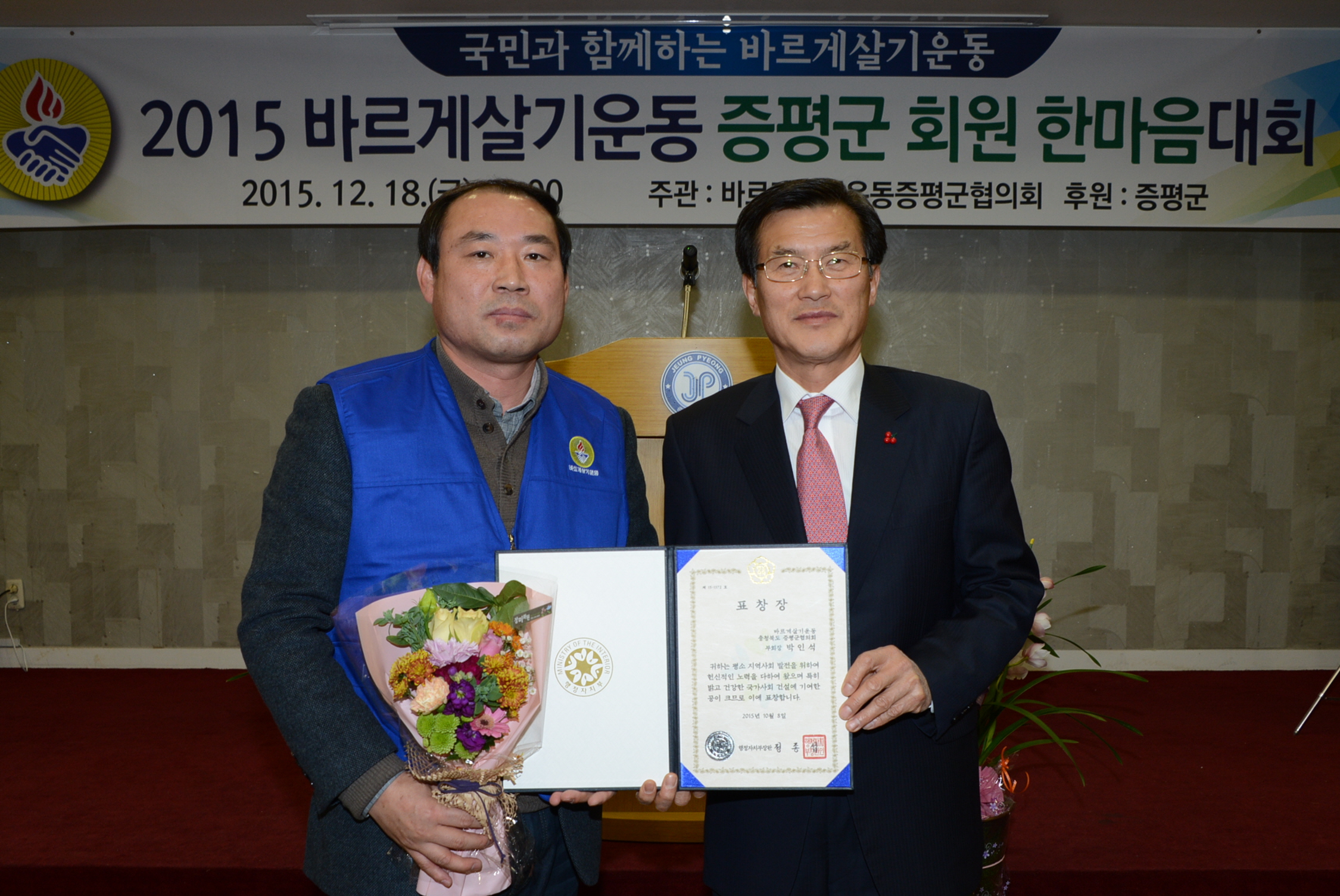 바르게살기운동증평군협의회(회장 연태희)는 18일 오후 6시 증평여성회관에서 홍성열 군수, 우종한 군 의장을 비롯해 협의회 회원 등 100여명이 참석한 가운데‘2015 바르게살기운동 한마음 갖기 회원대회’를 개최했다.(보도자료실 참조)