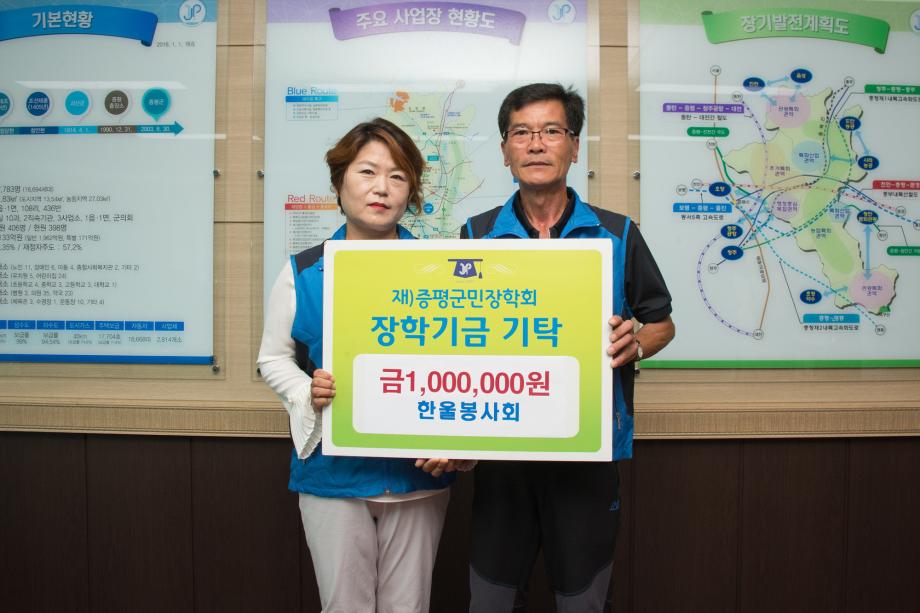 한울봉사회(회장 주동호)는 27일 지역의 인재육성을 위해 (재)증평군민장학회(이사장 홍성열 증평군수)에 100만원의 장학기금을 기탁했다.