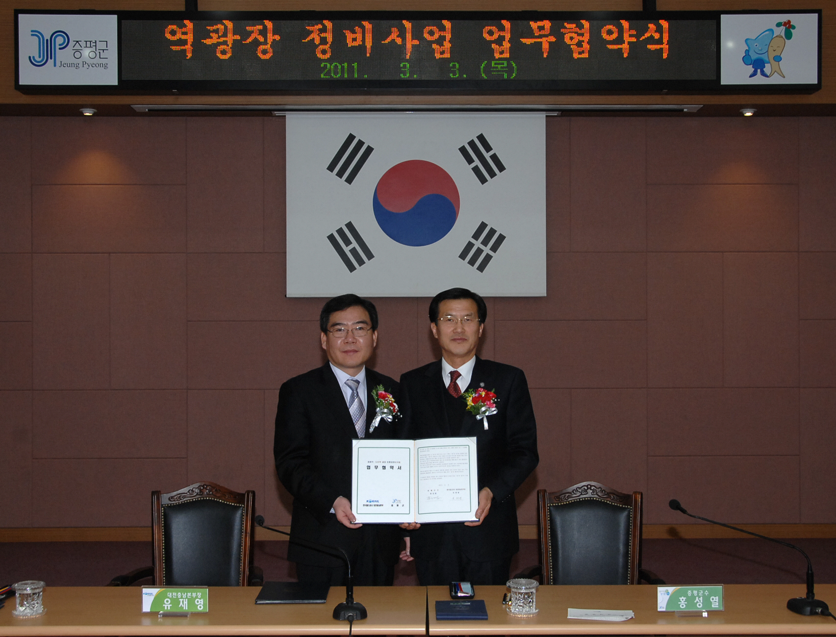 증평군은 3일 오전 11시 군청 대회의실에서 한국철도공사 대전충남본부와 업무협약을 체결하고 증평역과 도안역 광장 친현경정비사업을 실시하기로 했다. [보도자료실 참조]
