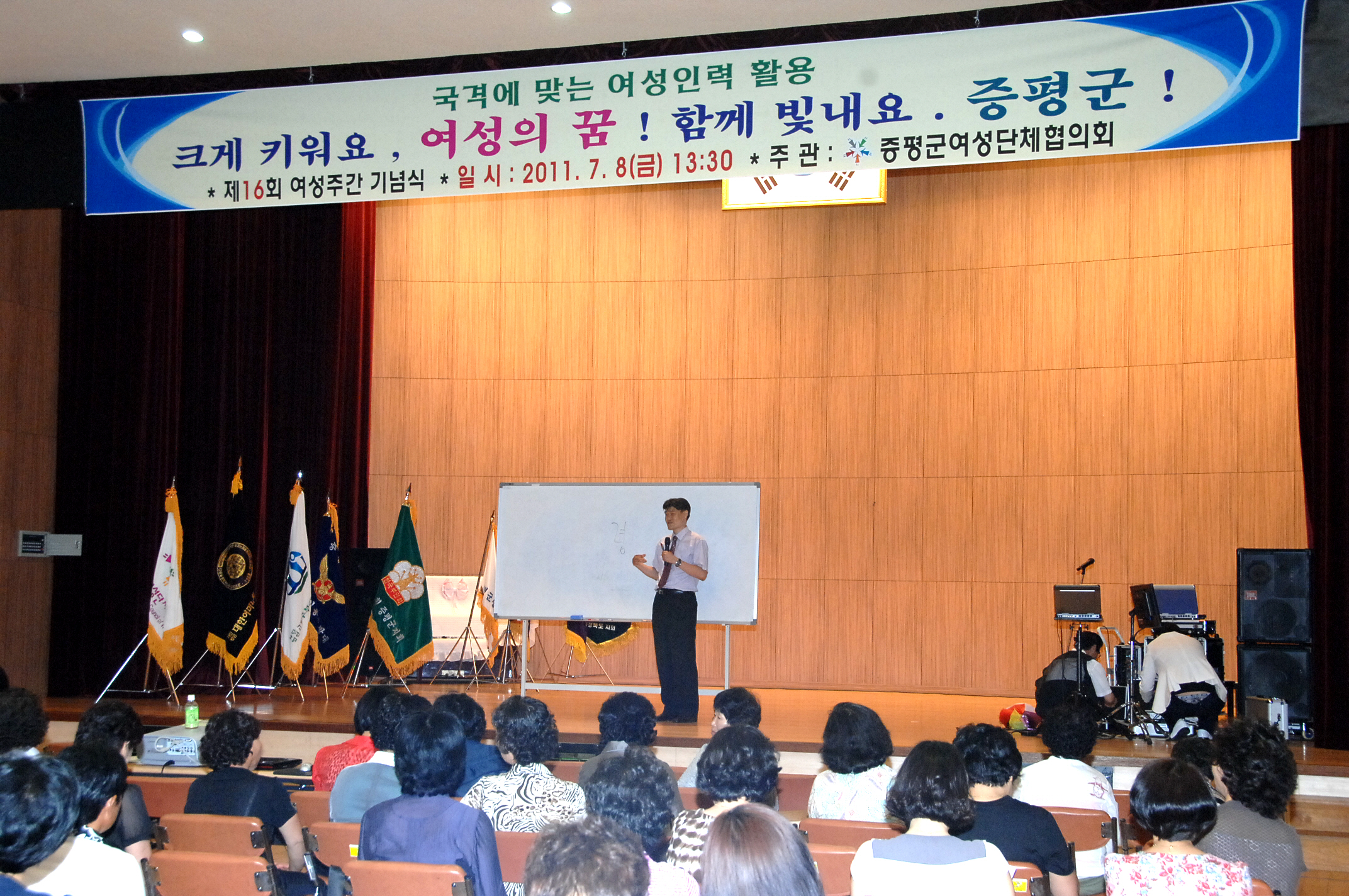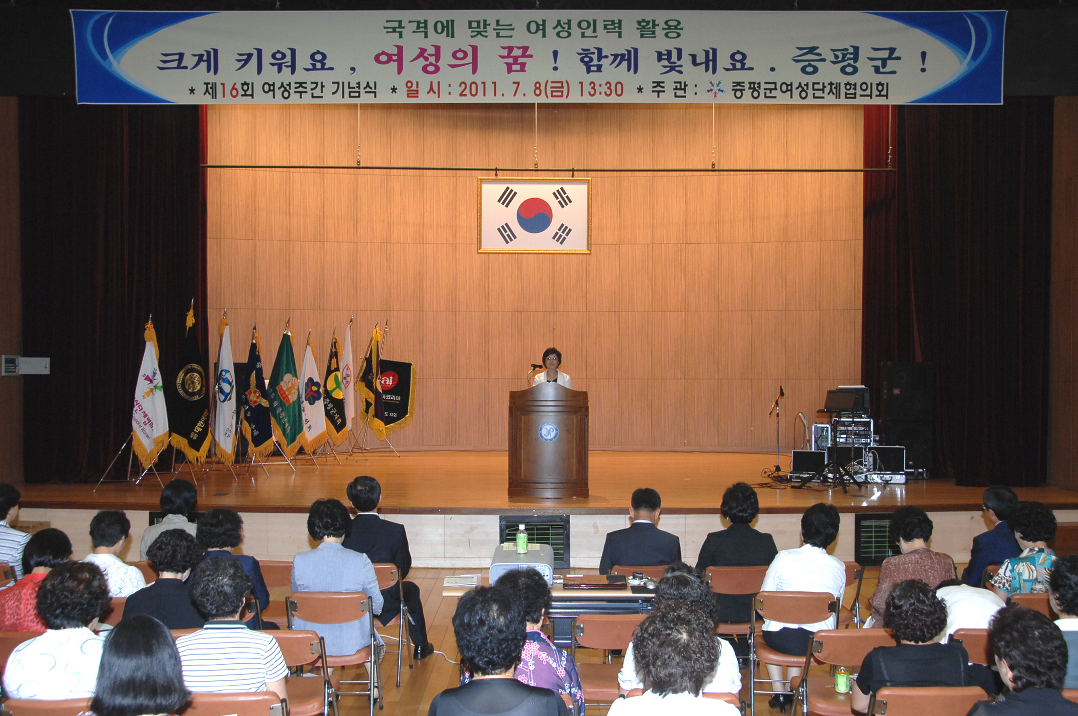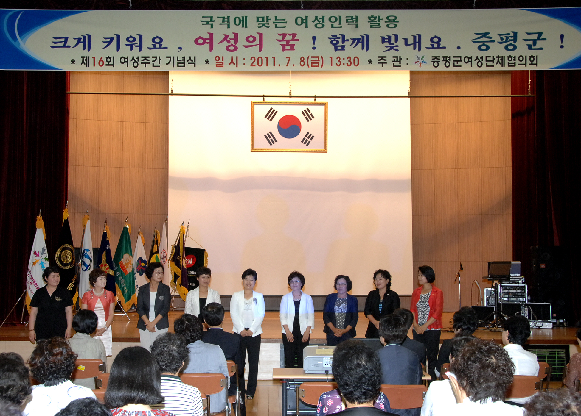 증평군은 8일 오후 1시30분 증평읍 내성동 청소년수련관 대강당에서 여성단체회원, 한부모가족, 다문화가족 등 300여명이 참석한 가운데 ‘크게 키워요 여성의 꿈! 함께 빛내요 대한민국!’을 주제로 제16회 여성주간 기념행사를 개최했다.[보도자료실 7월 5일자 참조]