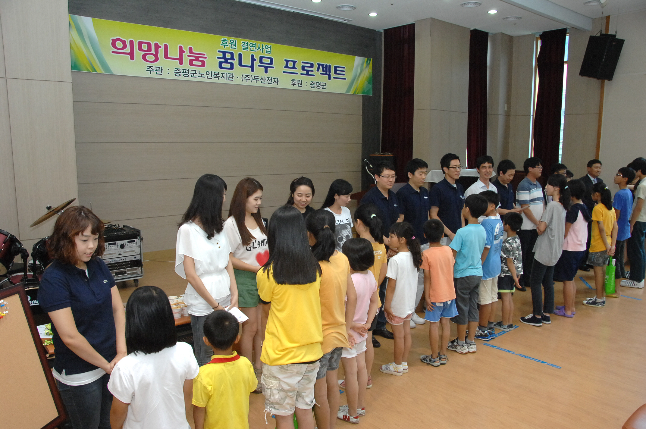 ‘희망나눔 꿈나무 프로젝트’ 제1회 행사가 27일 오후 3시, 두산전자 구자영 부장을 비롯한 직원 10명과 증평군 지역 내 꿈나무 16명이 참석한 가운데 노인복지관 강당에서 열렸다.[보도자료실 참조]