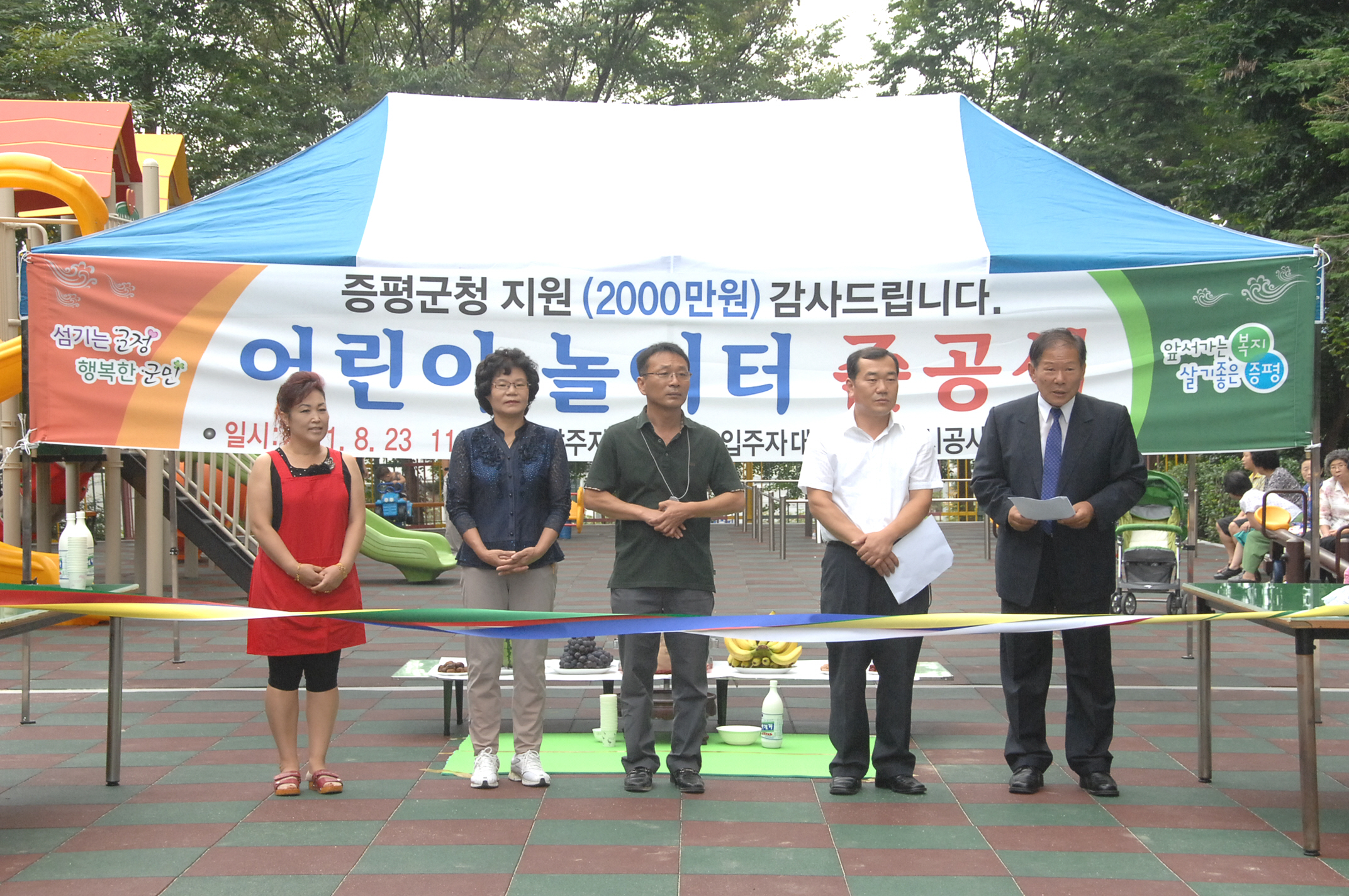 증평 삼일아파트 어린이 놀이터가 깨끗하고 안전한 놀이터로 새롭게 단장되어. 23일 오전 11시 홍성열 증평군수, 신현식 입주자 대표,박흥규 KT 증평자사장을 비롯한 아파트 주민들이 참석한 가운데 삼일아파트 어린이놀이터 준공식이 열렸다.[증평포커스 참조]