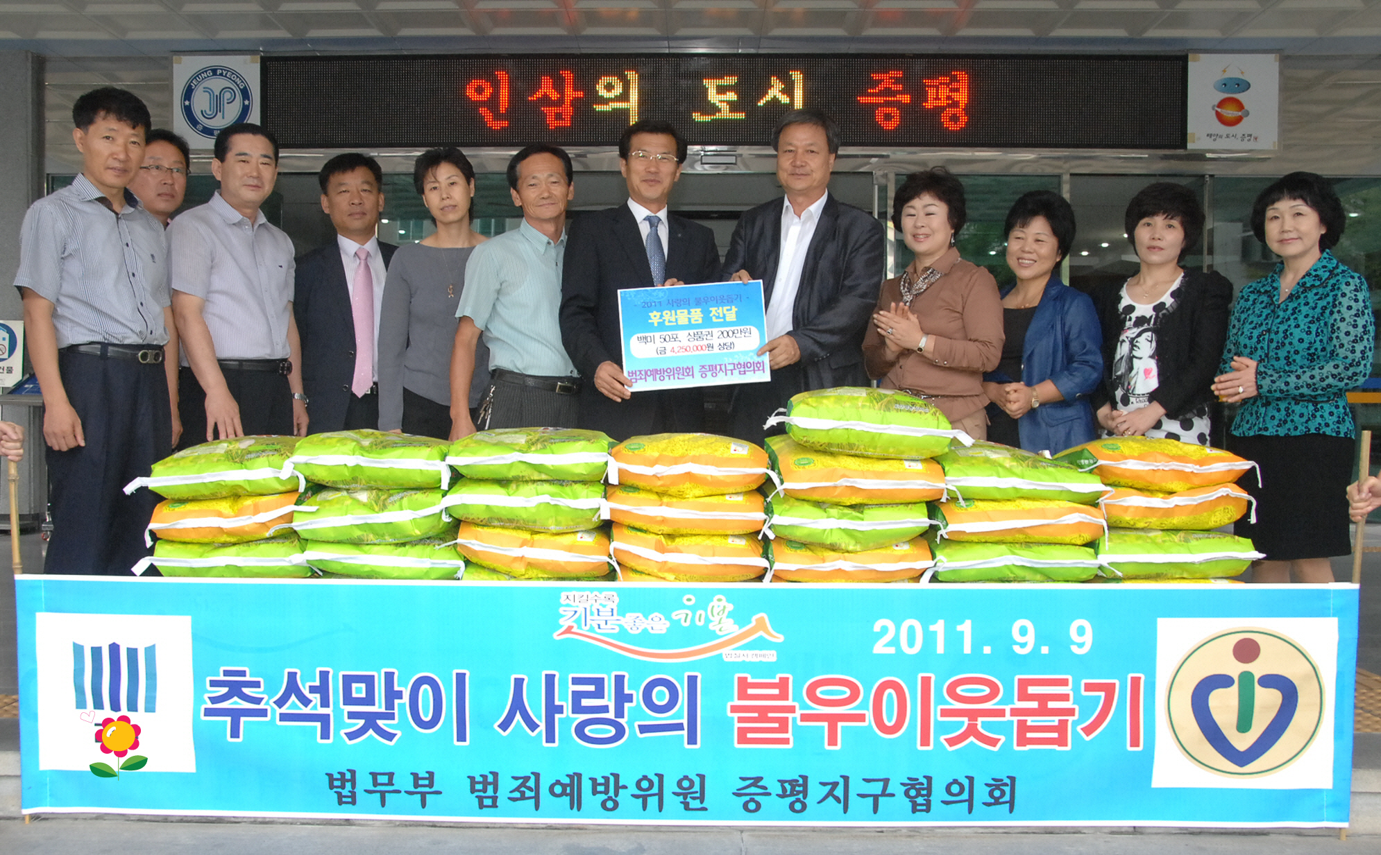 범죄예방위원회 증평지구협의회(회장 박성현)은 9일 오전 10시 30분 한가위를 앞두고 지역 내 형편이 어려운 이웃을 위해 써 달라며 백미 20Kg들이 50포와 200만원 상당의 상품권을 증평군에 기탁했다.