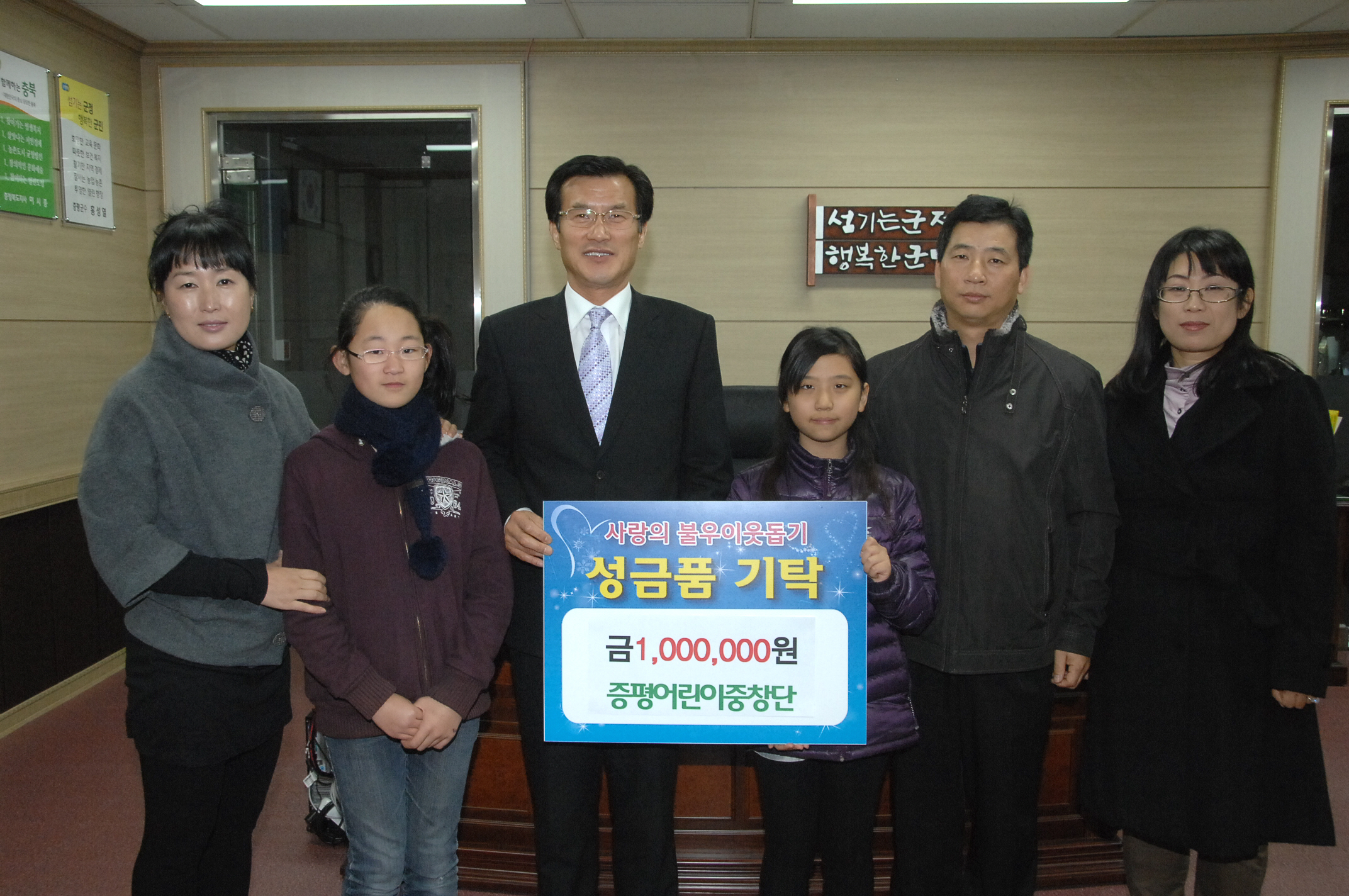 증평어린이중창단는 어려운 이웃들이 따뜻한 겨울을 보낼 수 있도록 하기 위해 12일 불우이웃돕기 성금 100만원을 증평군에 전달했다. [보도자료실 참조]