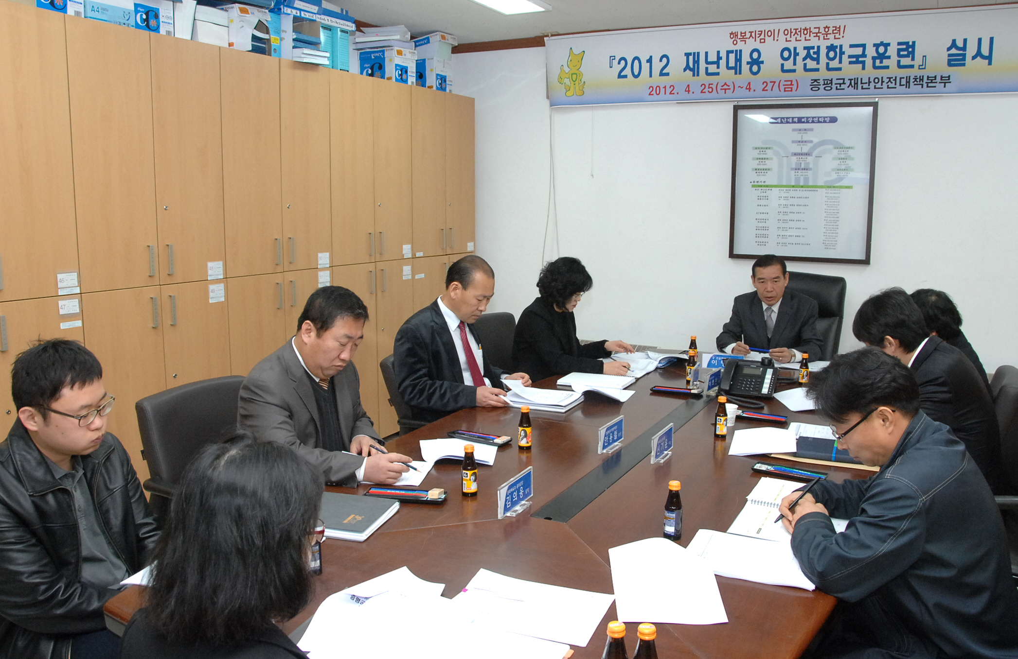 증평군은 오는 25일부터 27일까지 3일간 실시되는 ‘2012 재난대응 안전한국훈련’을 대비해 2일 오전 11시 군 재난종합상황실에서 관계자회의를 개최했다. [보도자료실 참조]