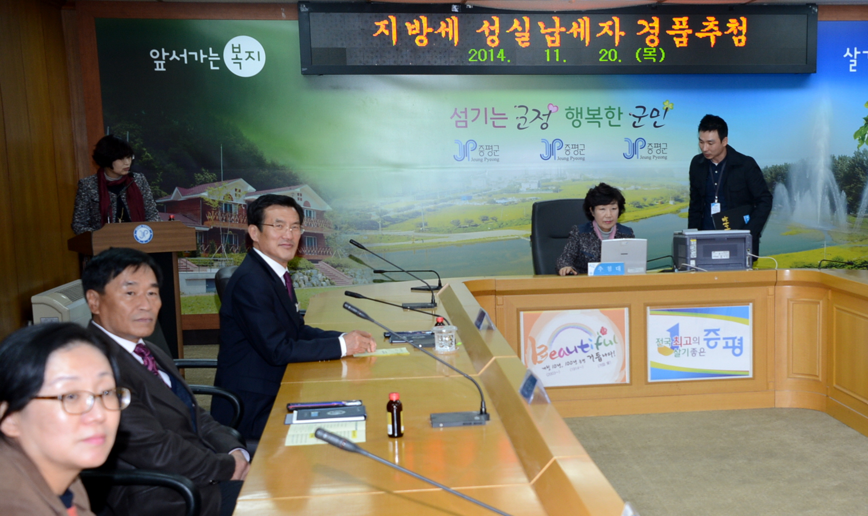 증평군은 20일 오후 2시에 증평군청 소회의실에서 홍성열 군수 및 지역내 주민등 10여명이 참석한 가운데 2014년 자동차세(6월) 및 재산세(7,9월)를 납기 내 납부한 주민을 대상으로 경품 추첨 행사를 실시했다. [보도자료실 참조]