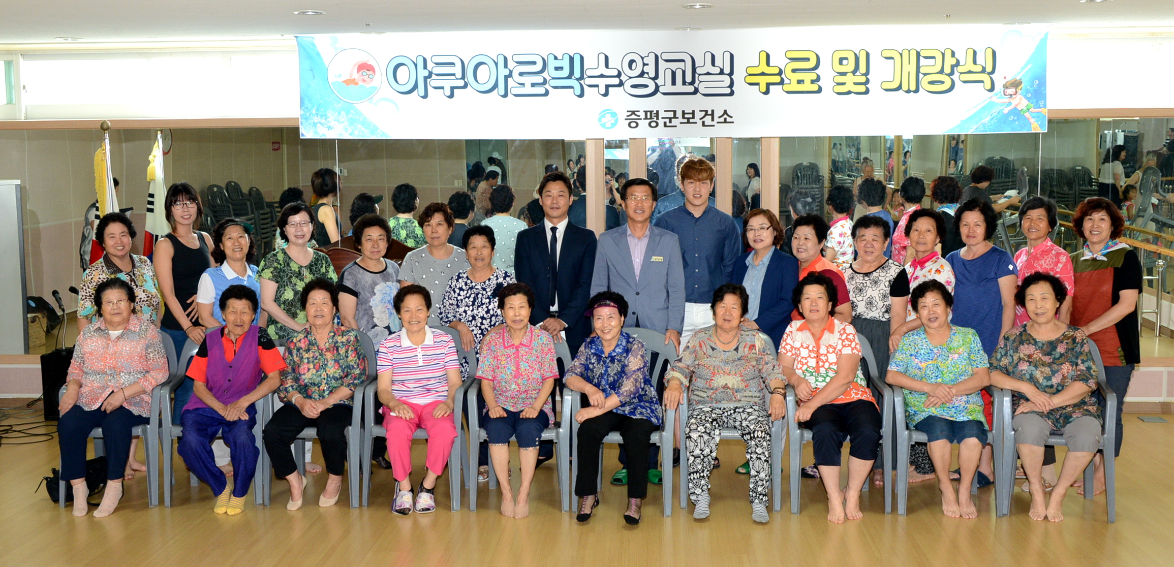 증평군보건소는 28일 오전 11시 30분 증평국민체육센터 2층 프로그램실에서 제15기 아쿠아로빅 수영교실 수료식과 제 16기 아쿠아로빅 수영교실 개강식을 수강생 등 관계자 80여명이 참석한 가운데 개최했다.(보도자료실 참조)