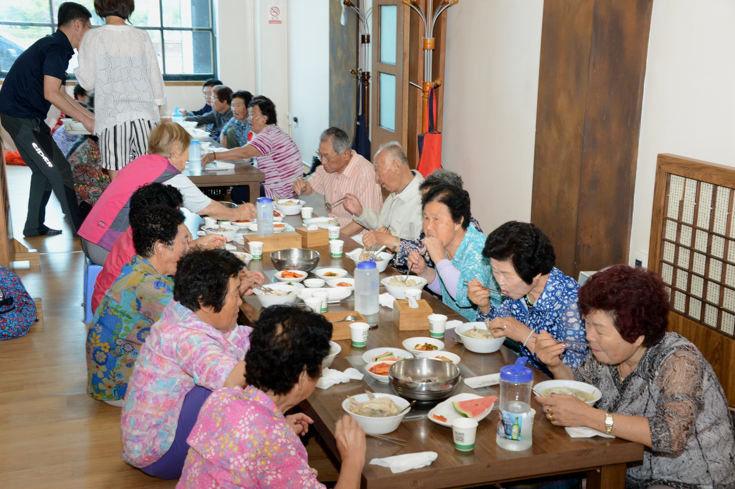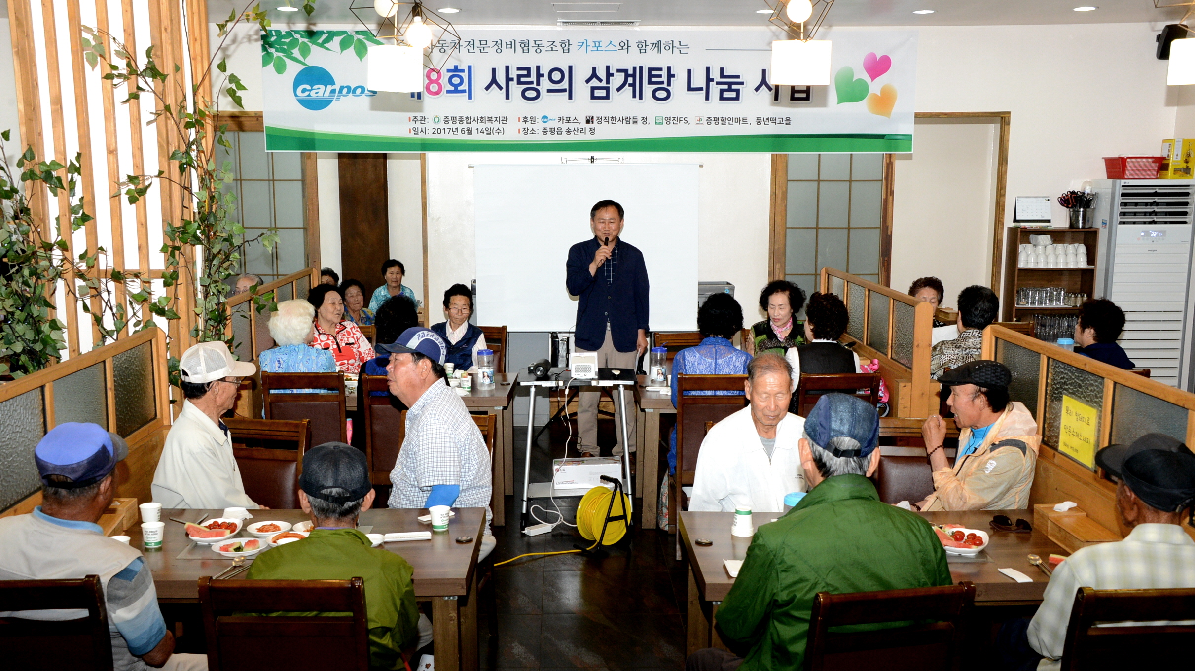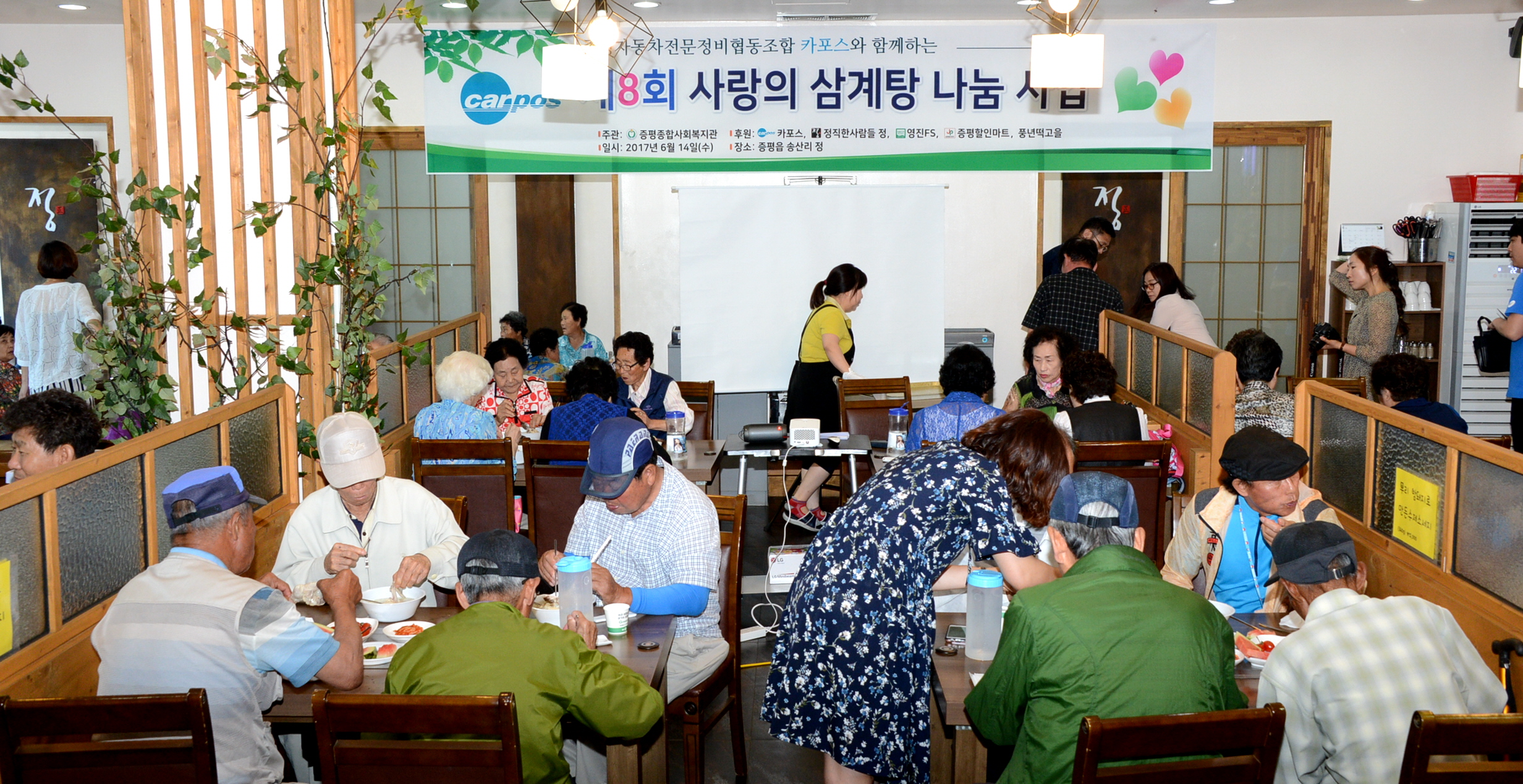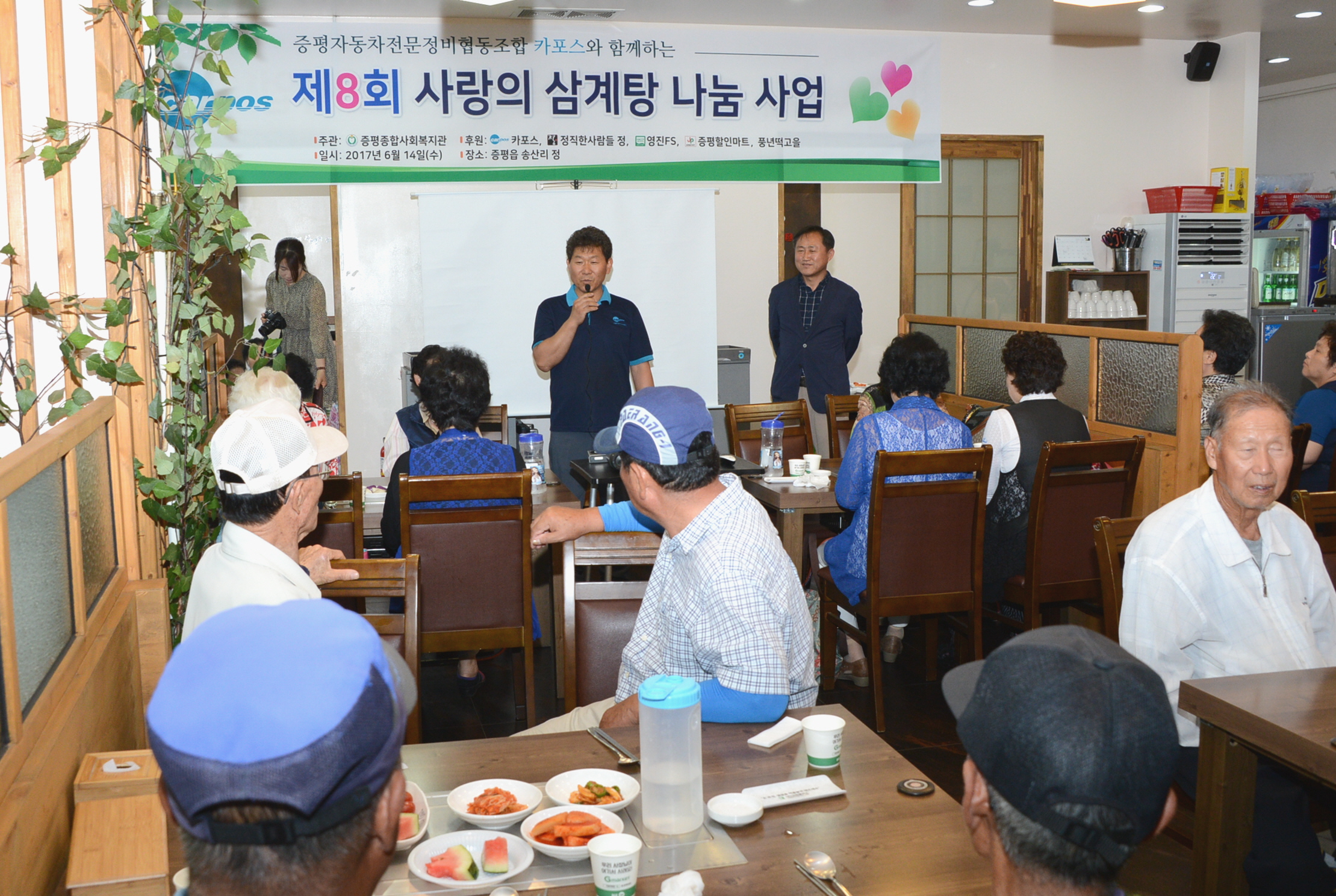 증평종합사회복지관(관장 양천공)은 14일 증평읍 송산리에 위치한 식당‘정’에서 카포스증평지회 후원으로 소외계층 및 독거어르신 100여명에게 무료로 삼계탕을 대접하는 제8회 사랑의 삼계탕 나눔 행사를 개최했다.[보도자료실 참조]