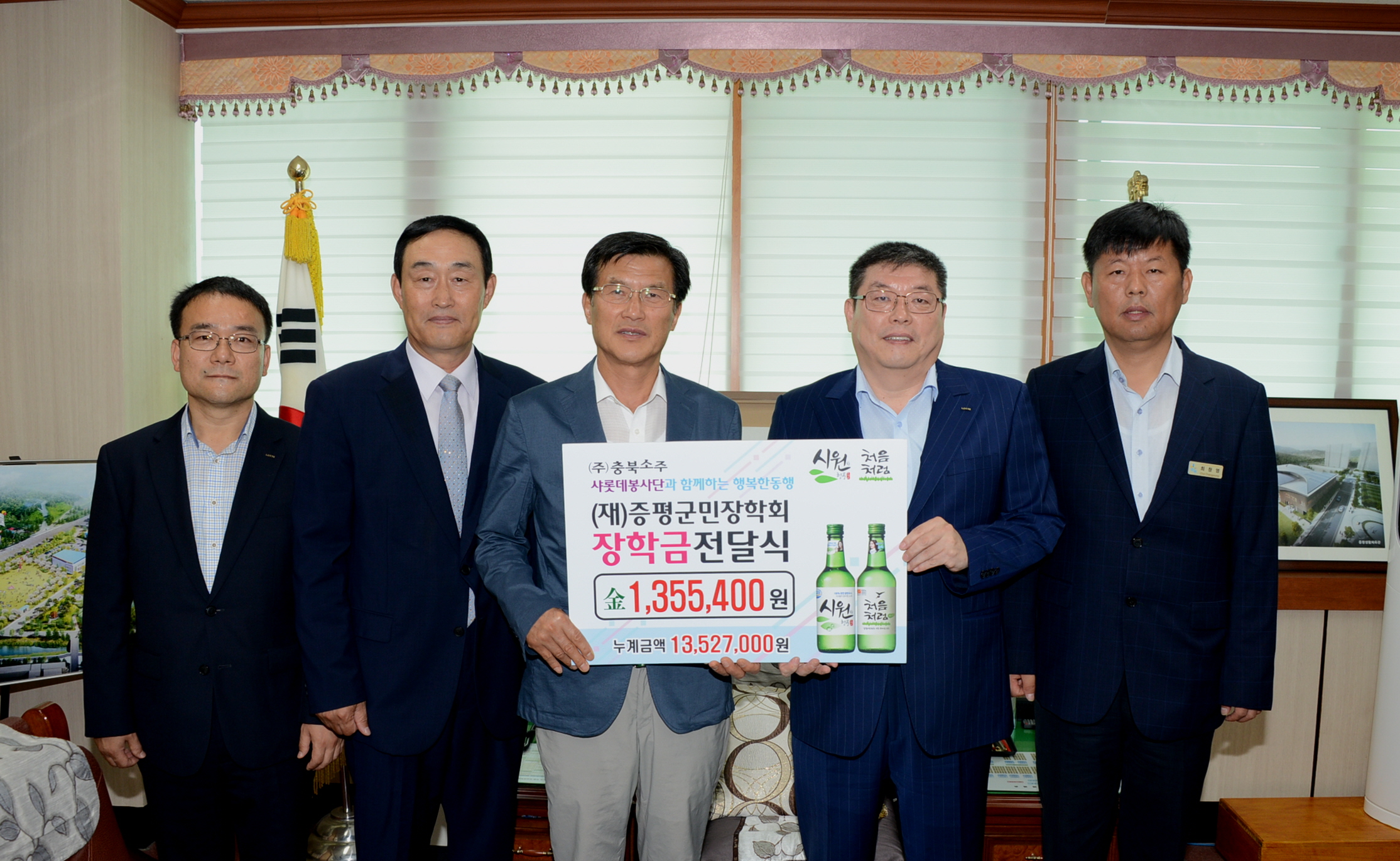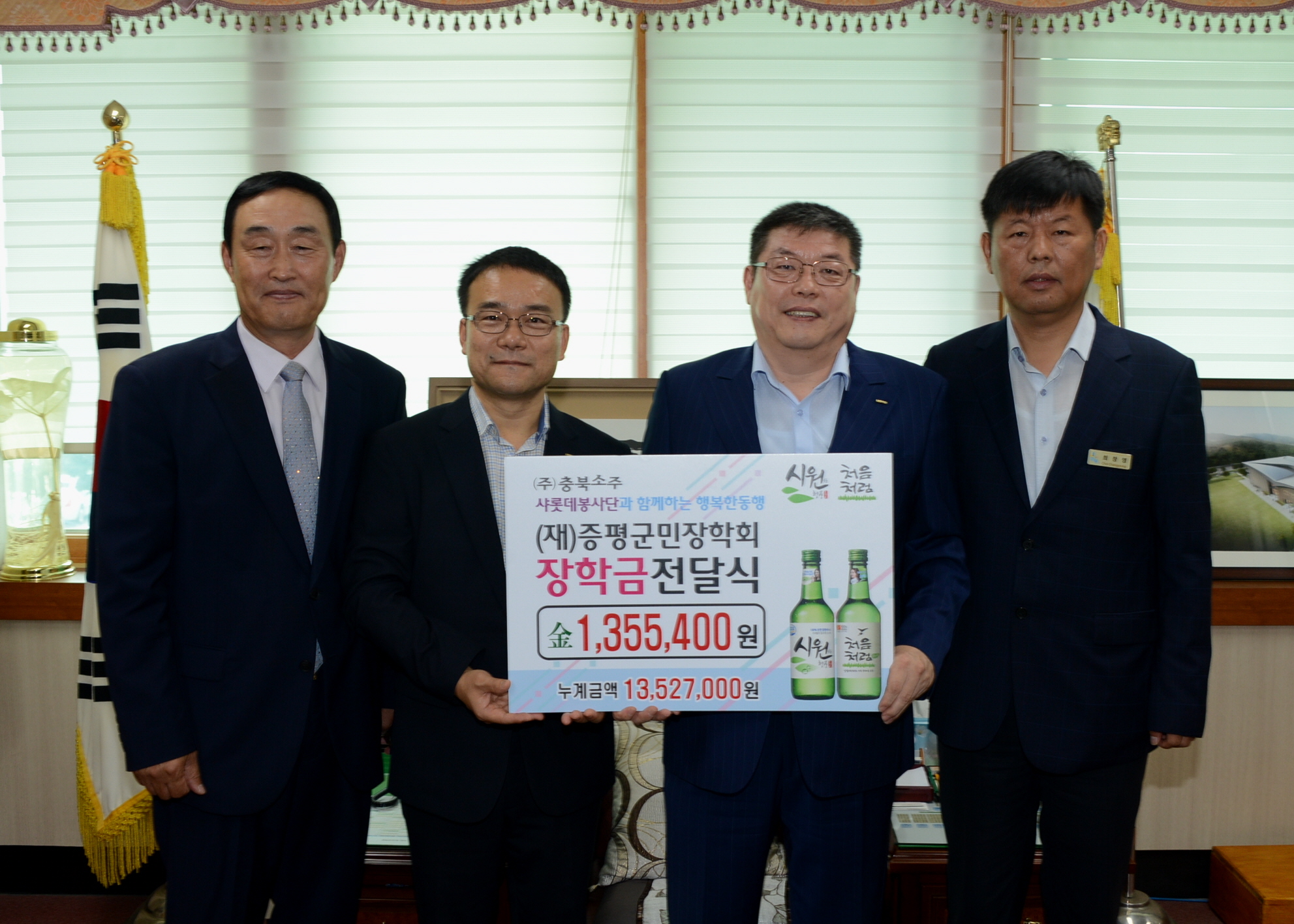 충북소주(대표이사 이종훈)가 21일 증평군청을 방문해 증평군민장학회(이사장 홍성열 증평군수)에 장학기금 135만5400원을 기탁했다.(보도자료실참조)