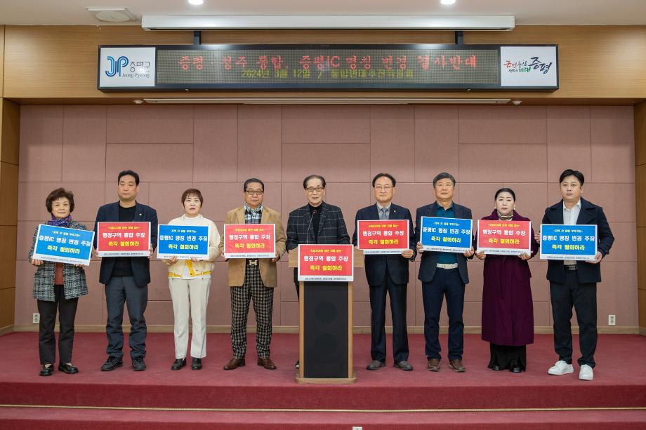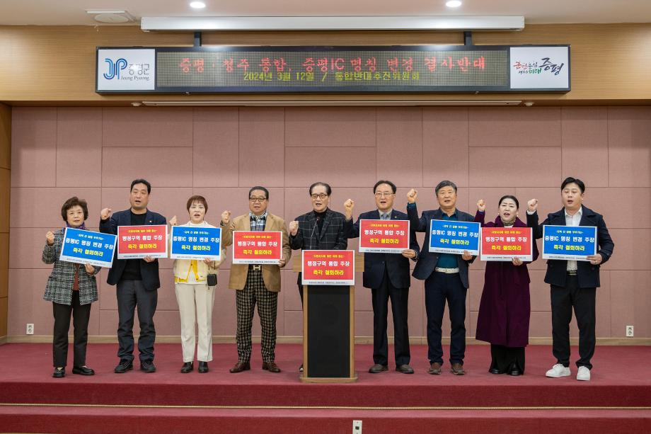 증평·청주 통합반대추진위원회는 지난 12일 군청 대회의실에서 ‘증평·청주 통합 및 증평IC 명칭 변경 주장에 대한 증평군민의 입장’을 밝히는 성명을 발표했다.
