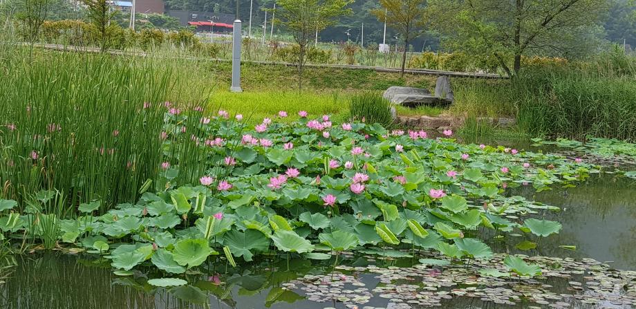 증평군 증평읍 율리 삼기저수지 생태습지에 폭염을 이겨낸 연꽃이 만개했다.