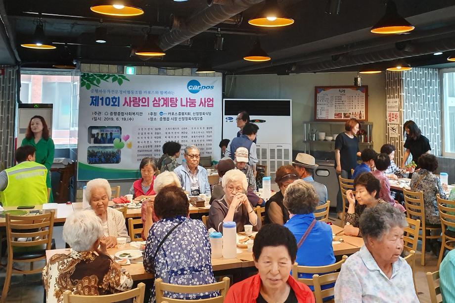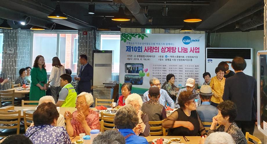증평종합사회복지관(관장 양천공)과카포스(충북자동차전문정비사업조합) 증평지회(지회장 김근한)는 19일 증평읍 장뜰 시장 내 위치한 신정정육식당에서 제10회 사랑의 삼계탕 나눔 행사를 개최했다.