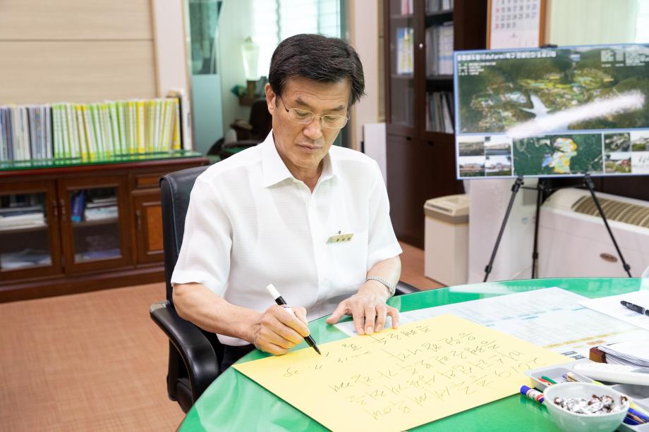 홍 군수는 29일 개인 SNS계정에 증평군민이 가장 많이 찾고 아끼는 곳인 미루나무 숲 공원에서 전통 무예이자 증평의 자랑인 인삼씨름단, 체육인들과 함께 대회 성공을 기원하는 응원의 메시지를 게재했다.