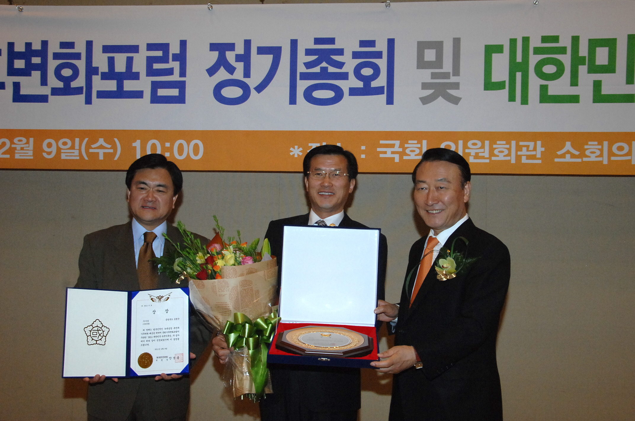 증평군이 9일 국회 의원회관에서 열린 “2011 대한민국 녹색기후상” 시상식에서 자치단체 부문 우수상을 수상했다. 사진은 안경률 국회행정안전위원장(사진오른쪽)이 홍성열 증평군수에게 상장을 수여하는 모습 [증평포커스 참조]