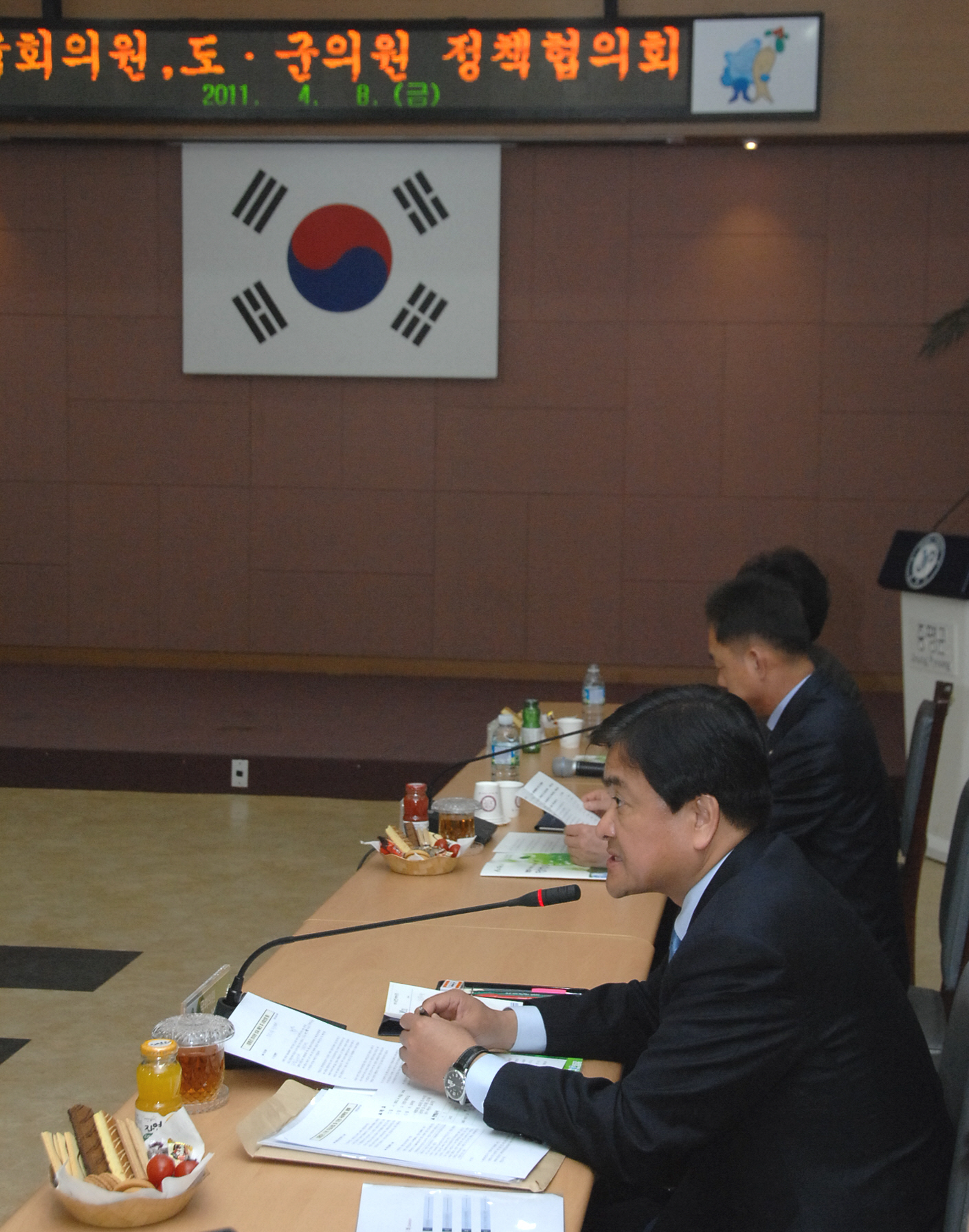 증평군은 8일 오후 2시 군청 대회의실에서 정범구 국회의원, 홍성열 군수, 김재룡 군의장과 군의원을 비롯한 관계 공무원 등 30여명이 참석한 가운데 정책협의 및 2012년도 국비 예산 확보를 위한 지역구 국회의원과의 정책 협의회를 개최했다.[보도자료실 참조]