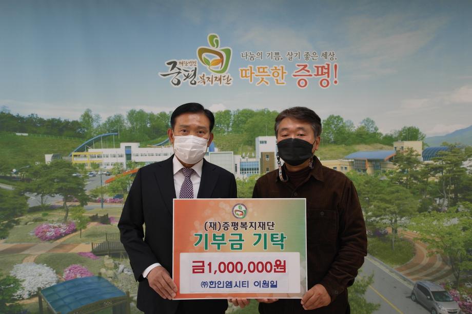 ㈜한인엠시티(대표이사 이원일)는 4일 (재)증평복지재단을 방문해 지역의 복지를 위한 기부금 100만원을 기탁했다.