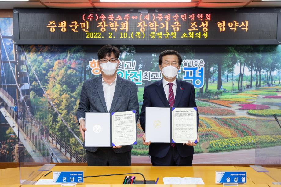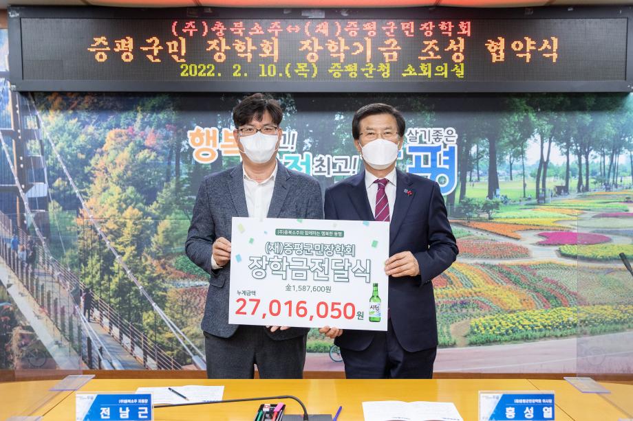 (주)충북소주(대표이사 정찬우)는 10일 증평군청을 방문해 (재)증평군민장학회(이사장 홍성열 증평군수)에 장학기금 158만7천6백원을 기탁했다.
