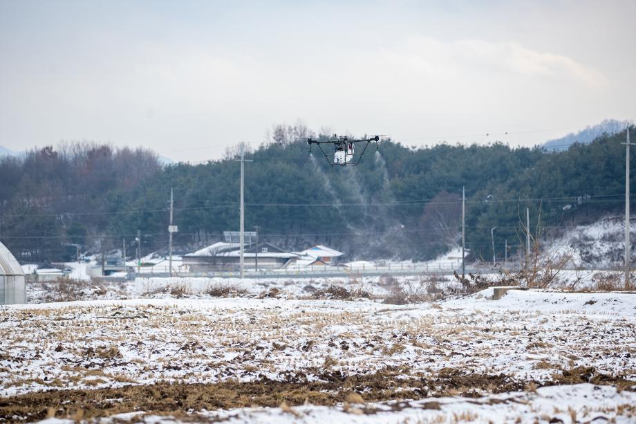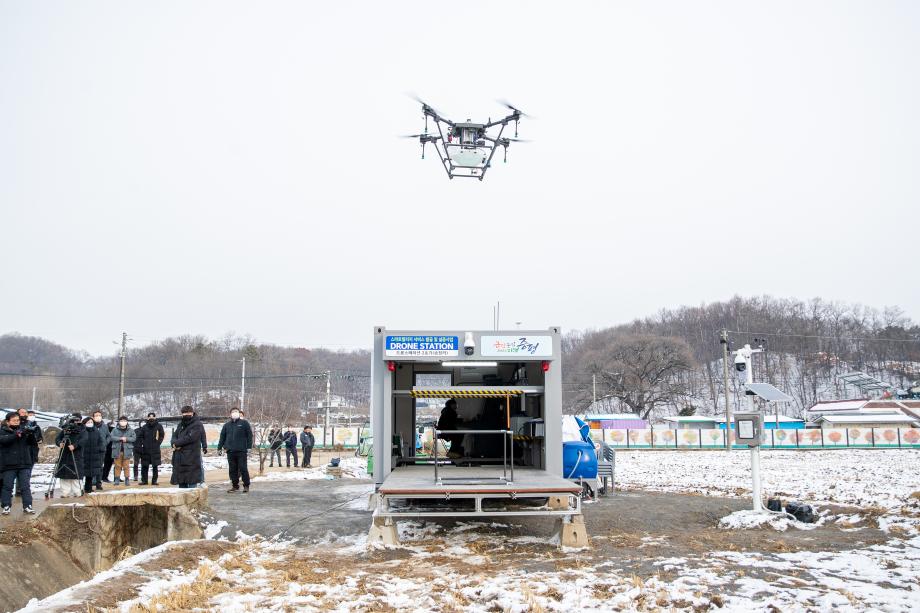 증평군이 올해 추진한 스마트빌리지 사업인 “드론과 트랙터를 활용한 자율농작업 서비스”의 현장 시연회를 15일 도안면 송정리 490 일원에서 개최했다.