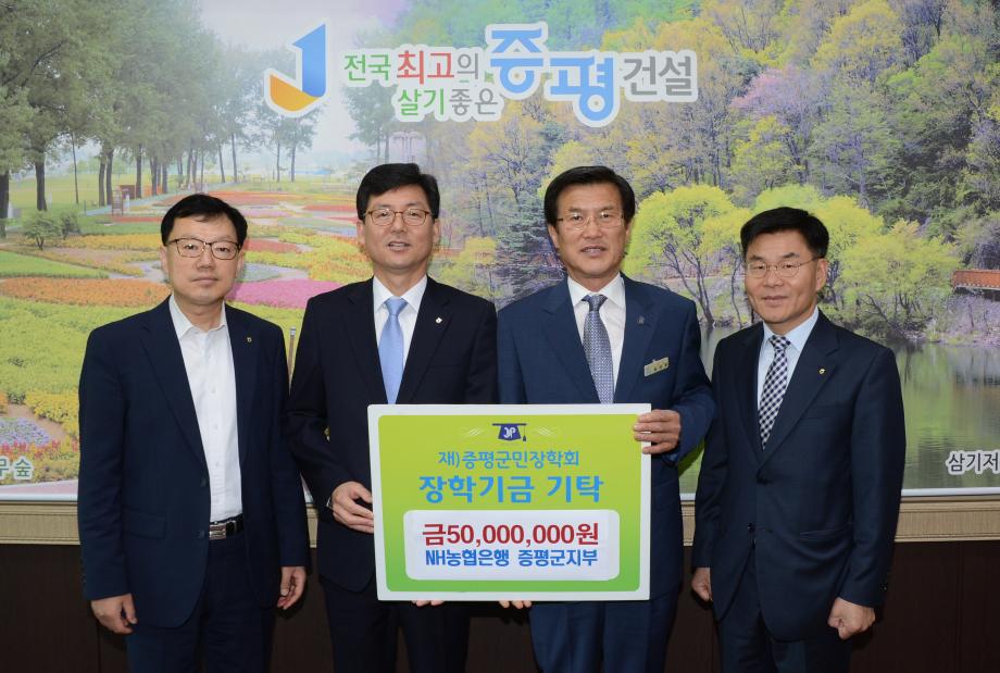 NH농협 증평군지부(지부장 김종표)는 8일 지역의 인재육성을 위해 써달라며 (재)증평군민장학회(이사장 홍성열 증평군수)에 5000만원을 전달했다.(보도자료실 참조)