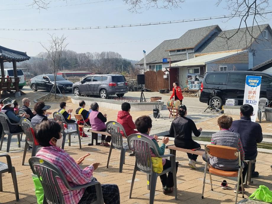 증평군 노인복지관이 12일 죽리 경로당에서 찾아가는 문화배달서비스 「바퀴달린 복지관」을 처음 선보였다.