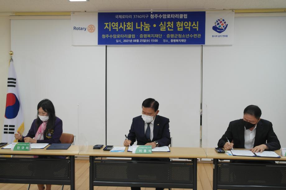 증평복지재단(이사장 이흥식)은 25일 청소년수련관 세미나실에서 증평군청소년수련관(관장 김병노), 청주수암로타리클럽(회장 안규미)과 청소년복지증진 및 지역사회 청소년인프라 구축을 위한 3자간 협약(MOU)을 체결했다.