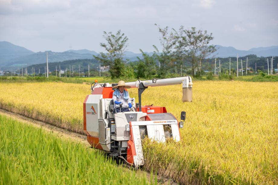 충북 증평군은 4일 증평읍 남차리 김태복 농가 논 0.6ha에서 올해 첫 벼 베기 행사를 했다.