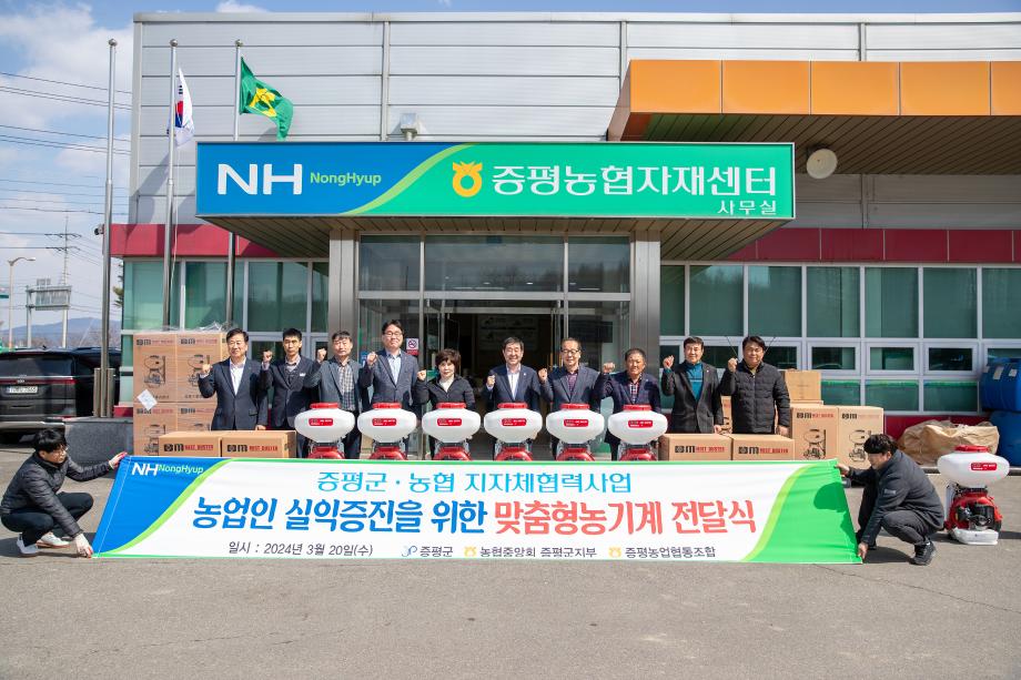 충북 증평군은 20일 증평농협 자재센터(증천리)에서 ‘증평군-농협 지자체 협력사업 농기계(비료살포기) 전달식’을 개최했다.