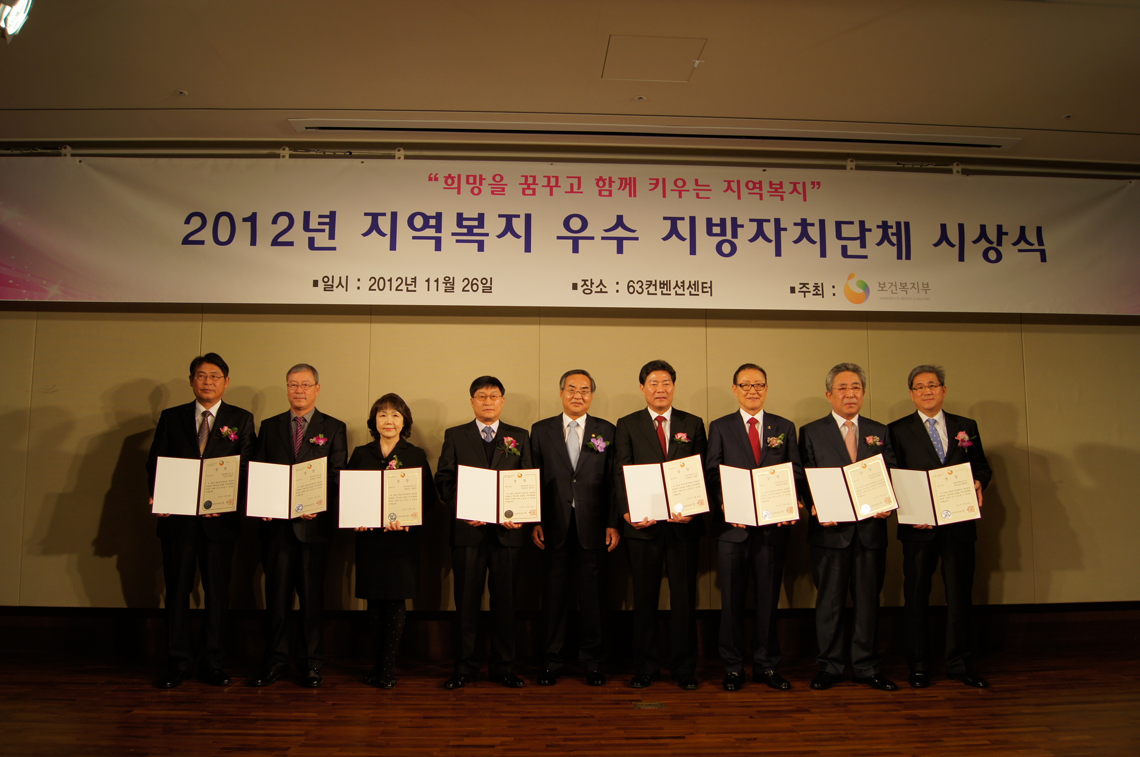 증평군은 보건복지부가 주관한 ‘2012 지방자치단체 복지정책 평가’ 희망복지지원단 운영성과 부문에서 최우수 기관으로 선정되어 26일 서울 63빌딩 컨벤션센터에서 열리는 시상식에서 보건복지부장관 표창과 함께 상사업비 8,000만원을 받는 영광을 차지했다. [보도자료실 참조]